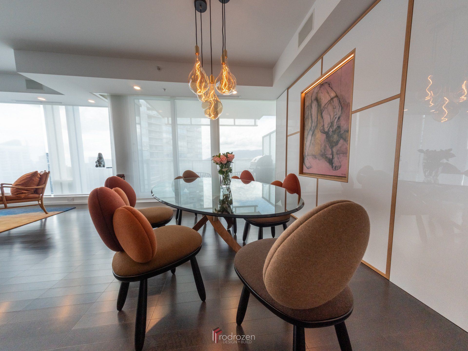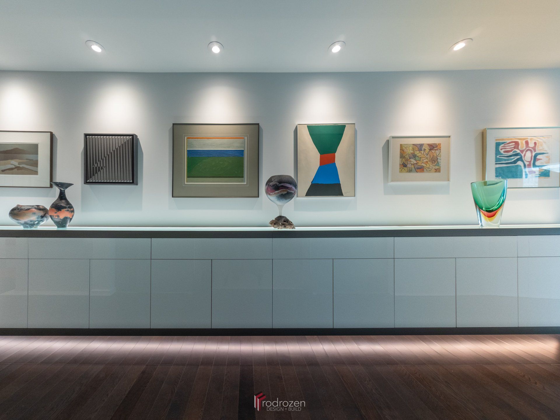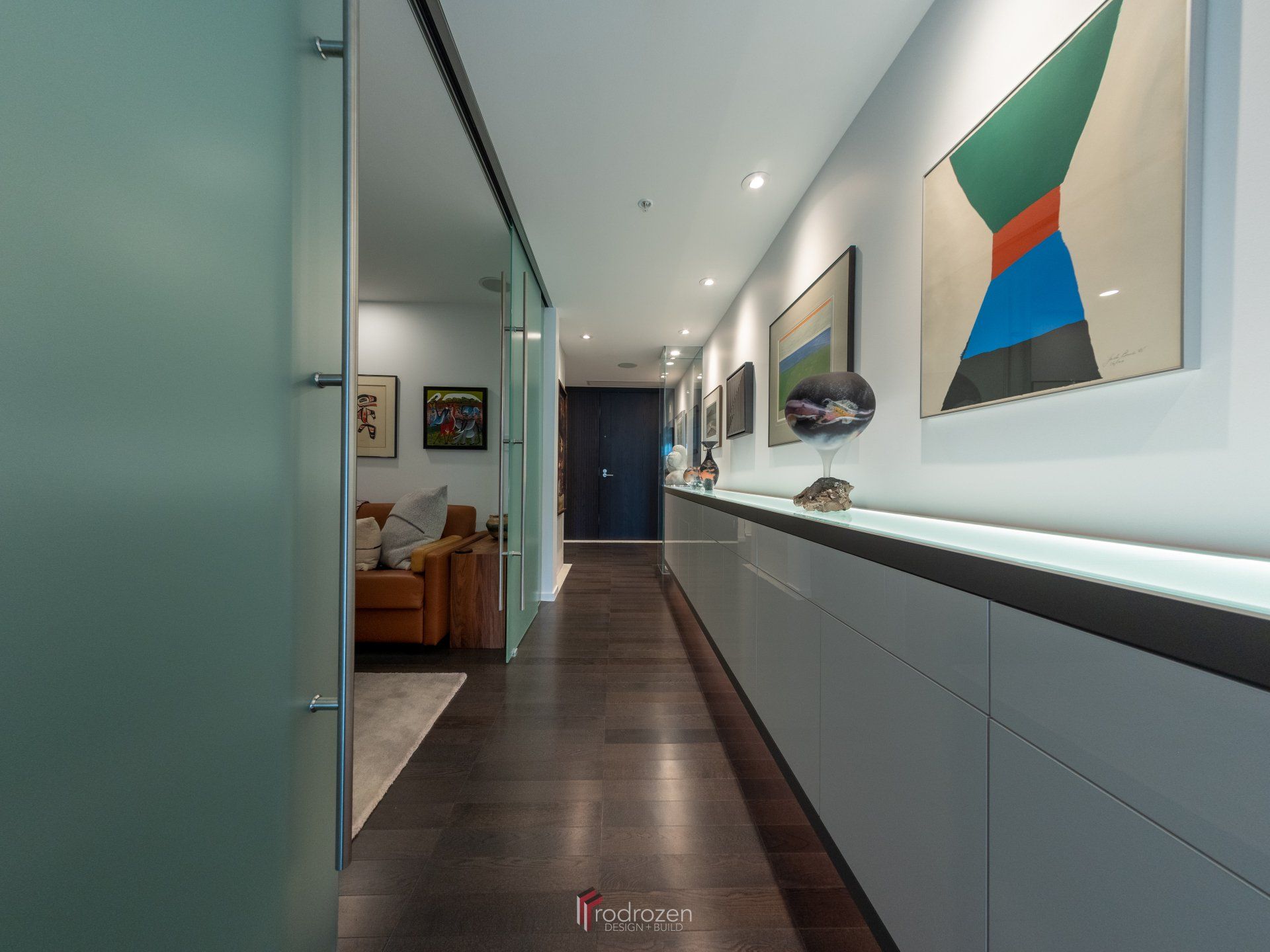 This 1253 sq ft condo was renovated and modernized for our client's needs by converting a two-bedroom condo into a eye catching space that uses innovative storage space as well as a beautiful art gallery to showcase our clients art collections.