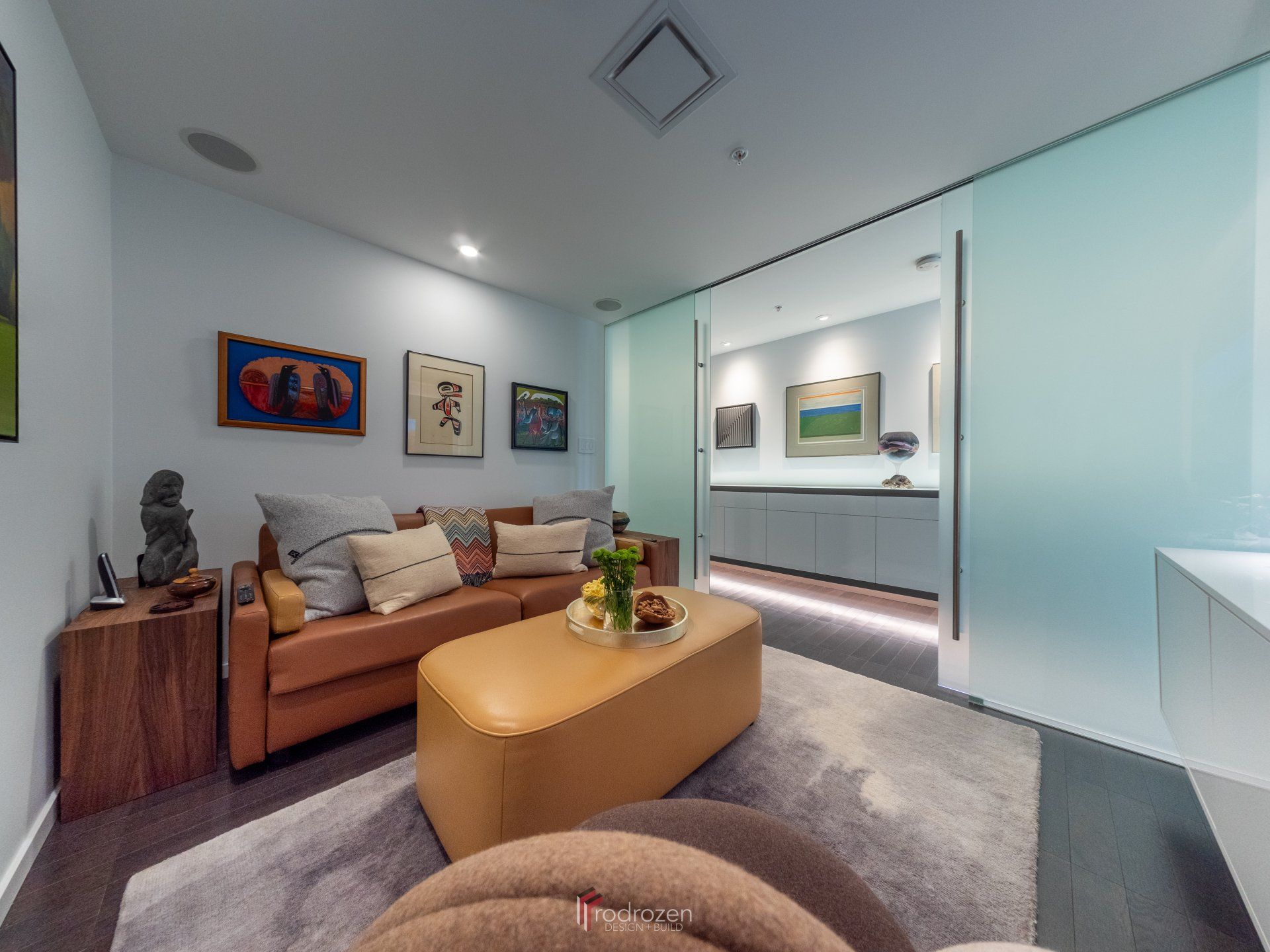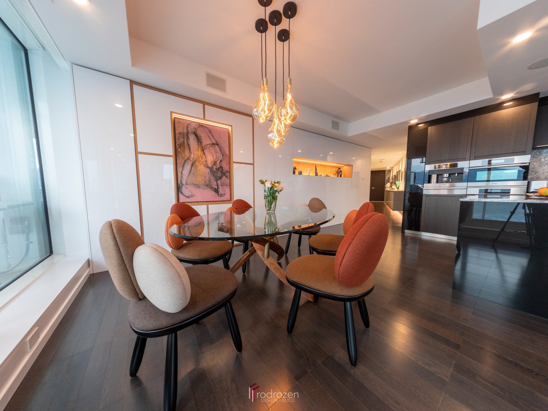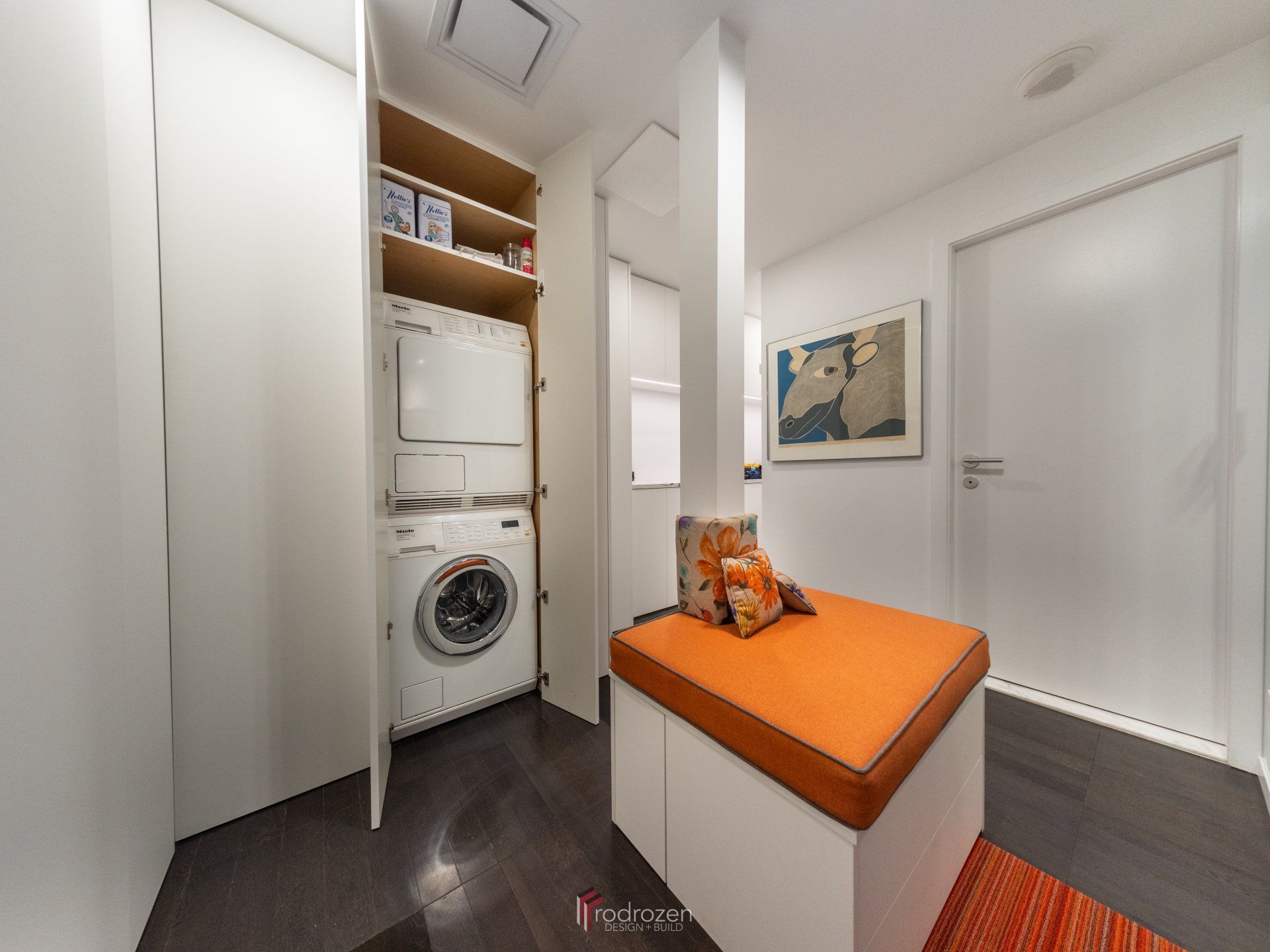 This 1253 sq ft condo was renovated and modernized for our client's needs by converting a two-bedroom condo into a eye catching space that uses innovative storage space as well as a beautiful art gallery to showcase our clients art collections.