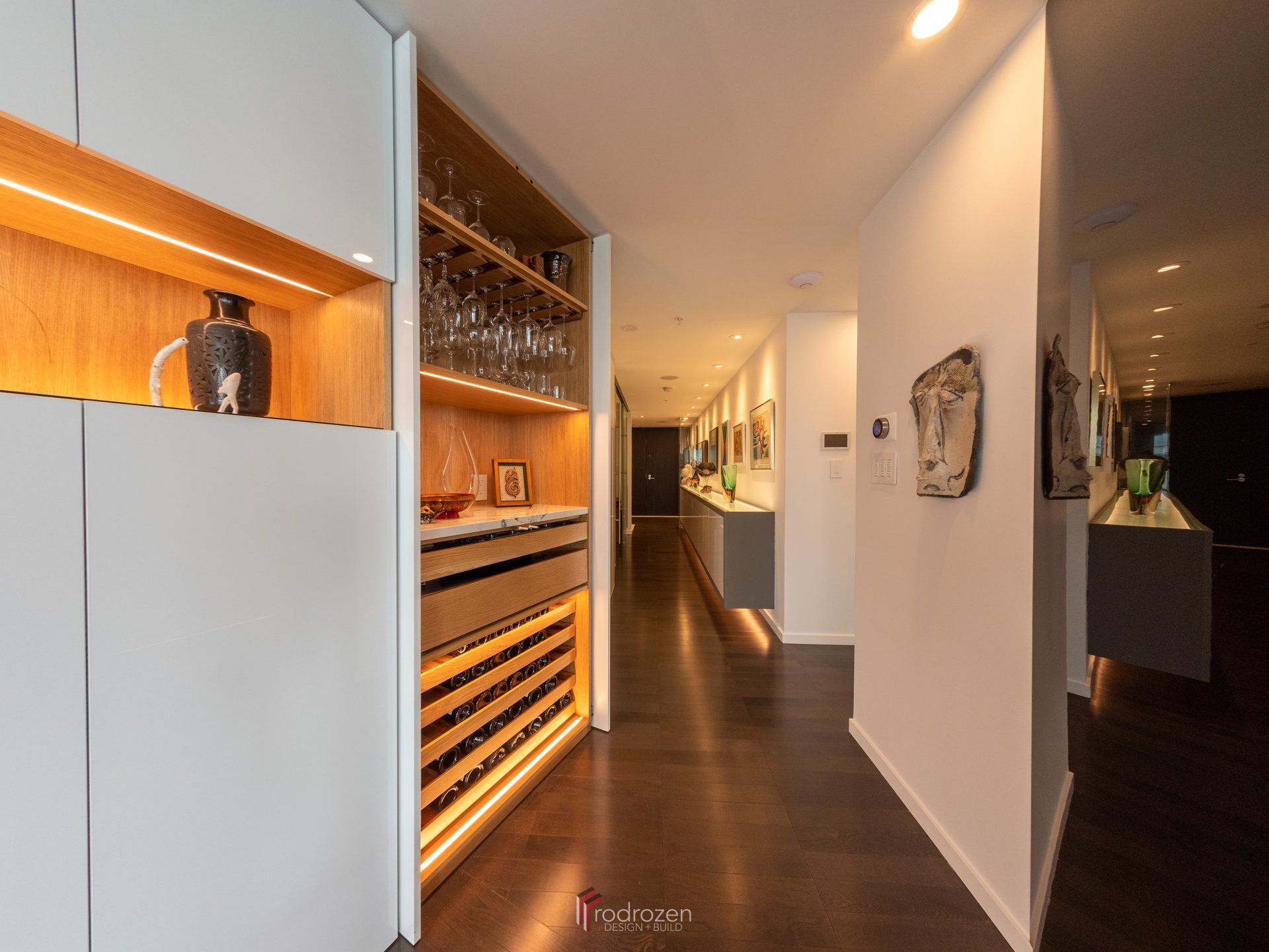 This condo renovation features a floating cabinet with LED up and downlighting, we extended the millwork with a functional and entertaining wine and cocktail bar that features LED lighting and soft touch wine draws. We continued this through to the dining space where we showcase our client’s art above the dining table. We added onto the existing kitchen design with a pantry space and a sliding pocket door office.