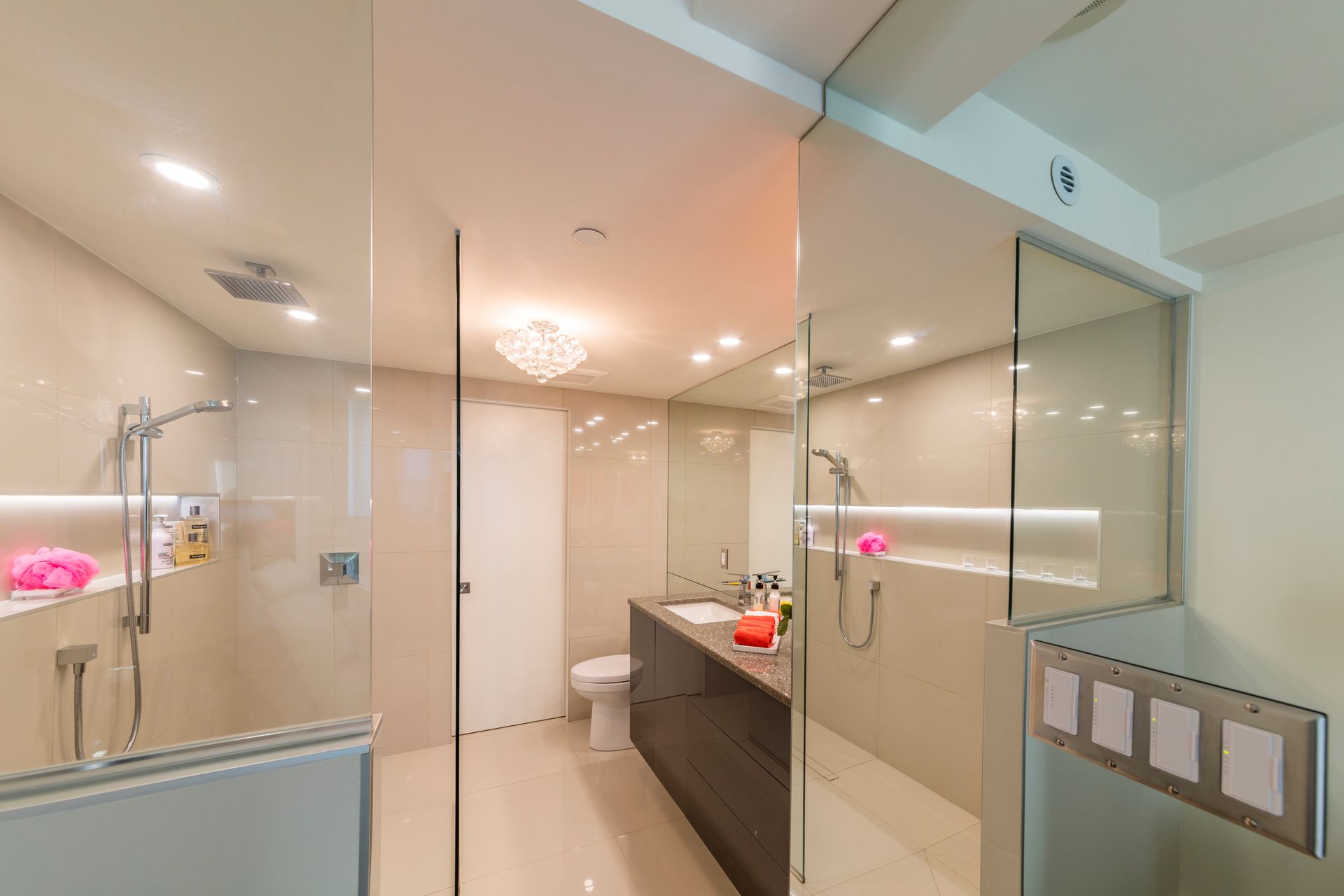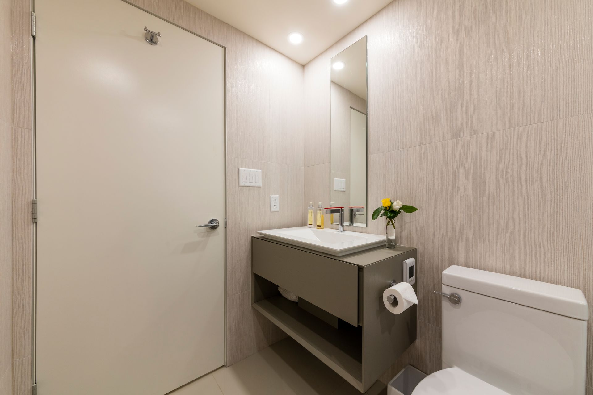 The overall design features a mixture of contemporary and traditional elements, with no shortage of wood finishes contrasting with quartz and crystal detailed finishes. Finally, our interior design touch of a modern art gallery design for the hallway finishes off this fine Vancouver condo home.