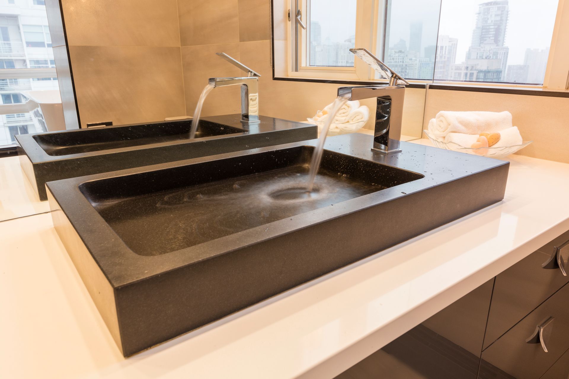 The ensuite bathroom is by far the stand-out feature in this condo renovation. We moved the bathtub to sit directly in front of the beautiful view of Vancouver. While the black granite raised sink and the Times Square faucet makes a splash.