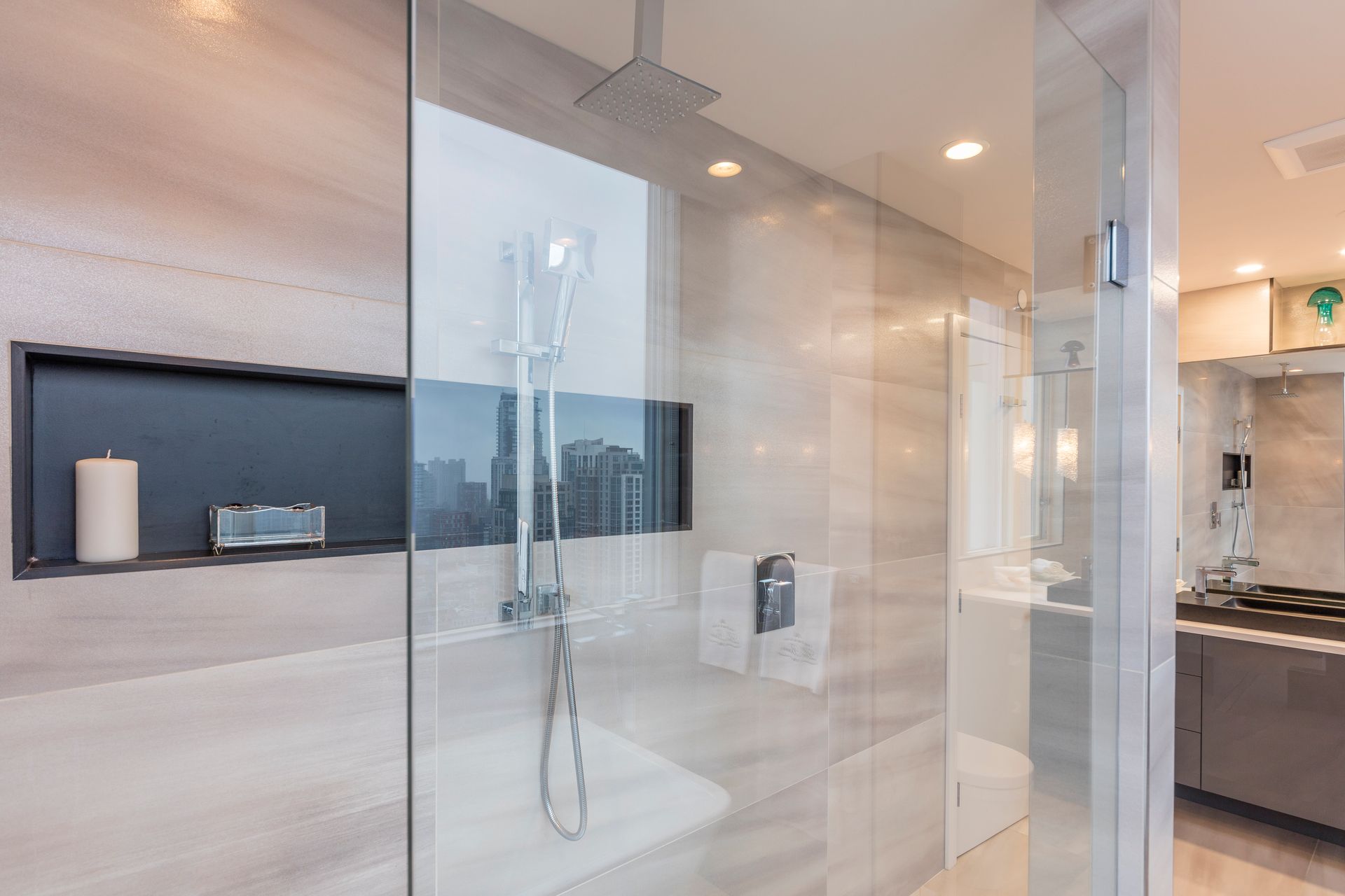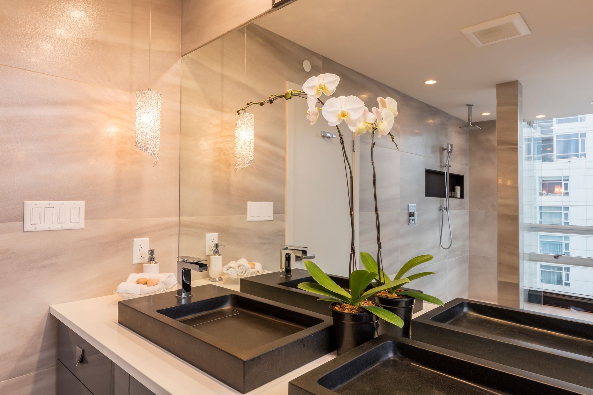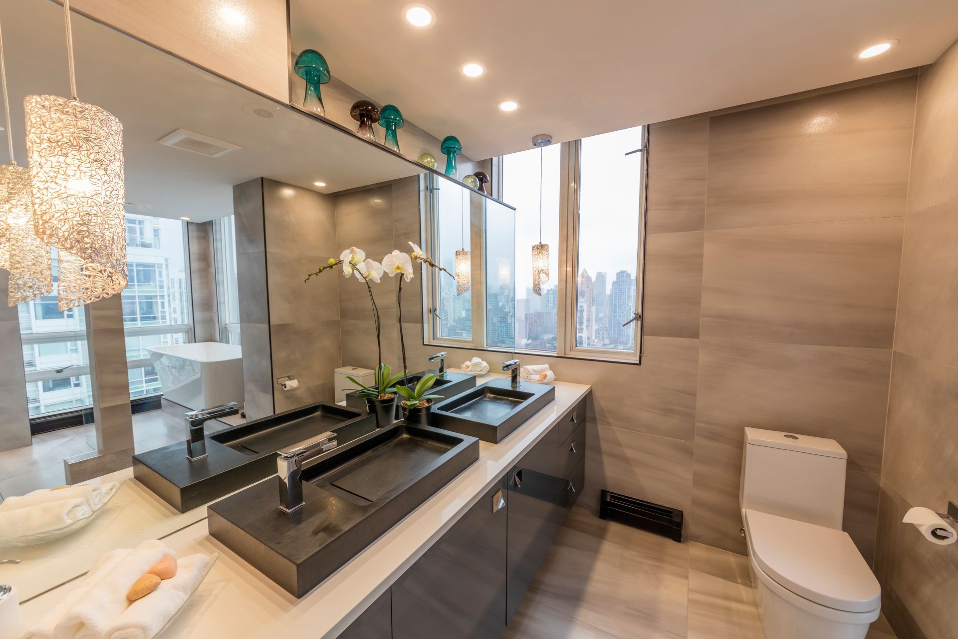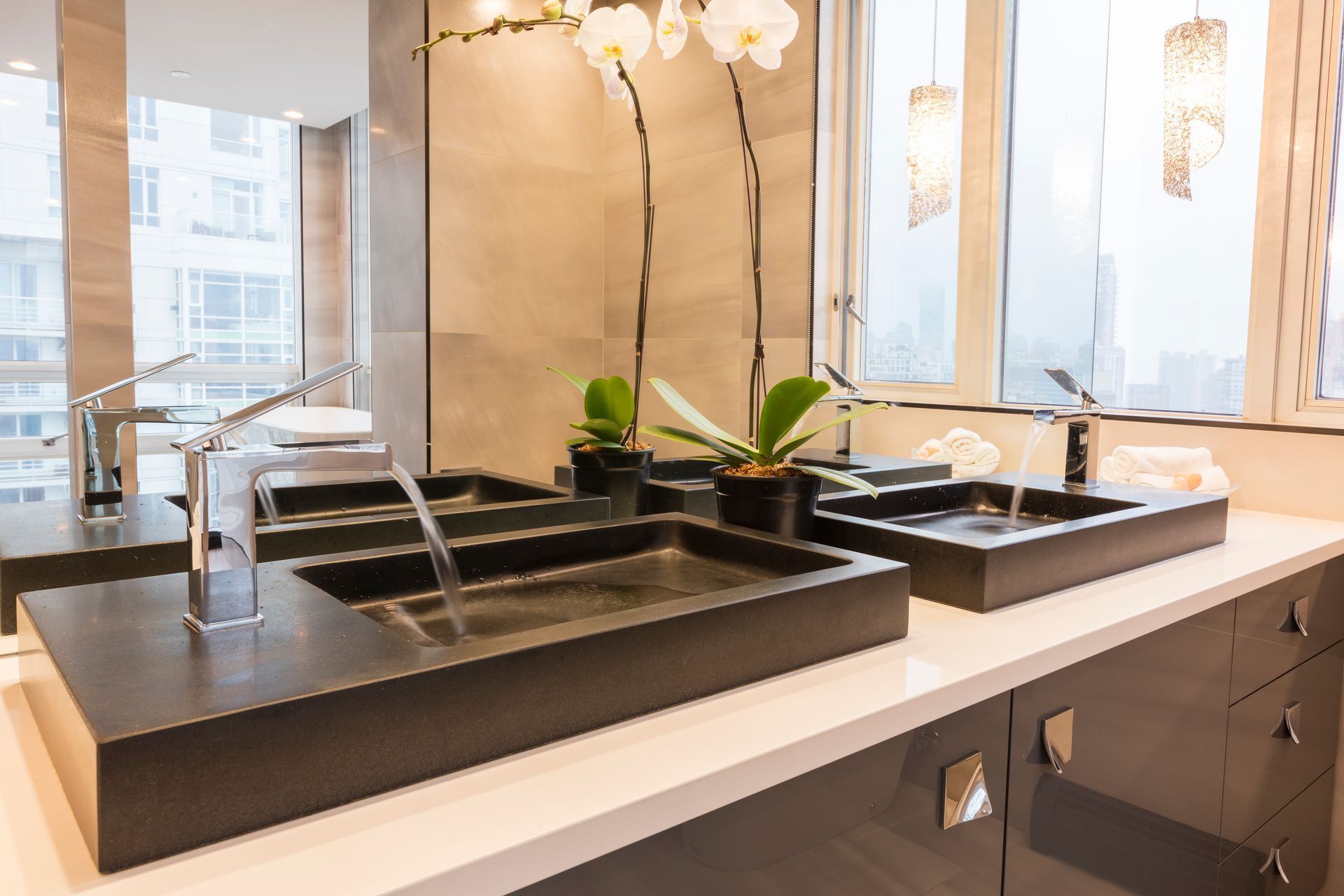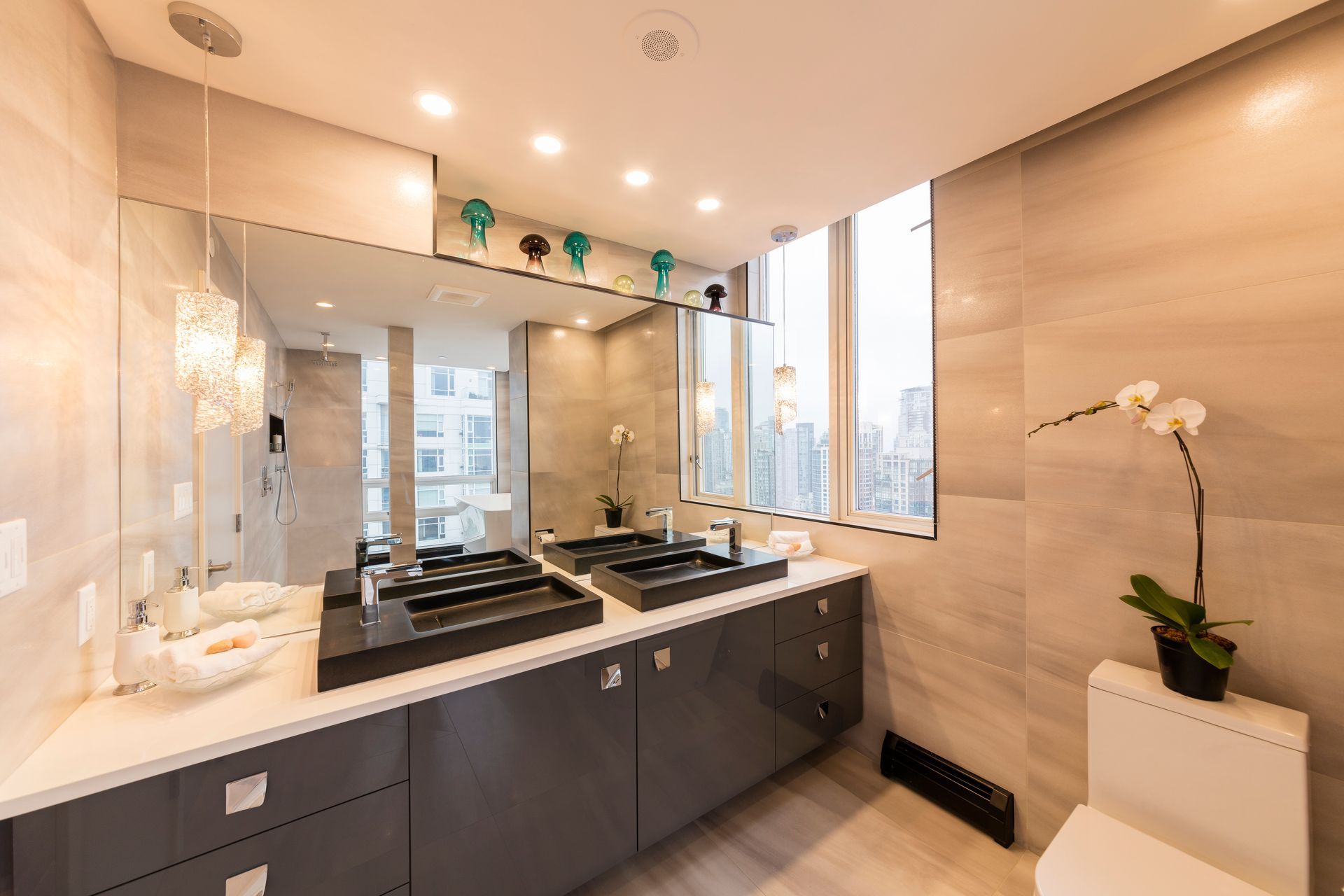 We converted the kitchen from a closed-in U shaped to an open island-style kitchen while maintaining a large kitchen nook area for food storage and preparation. The ensuite bathroom is by far the stand-out feature here. We moved the bathtub to sit directly in front of the beautiful view of Vancouver. While the black granite raised sink and the Times Square faucet makes a splash.