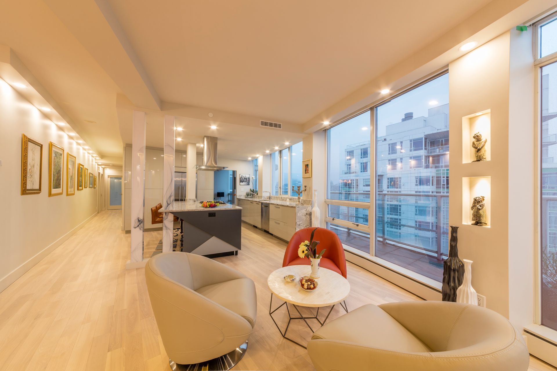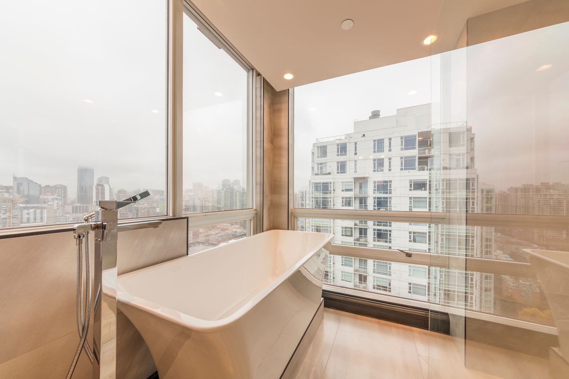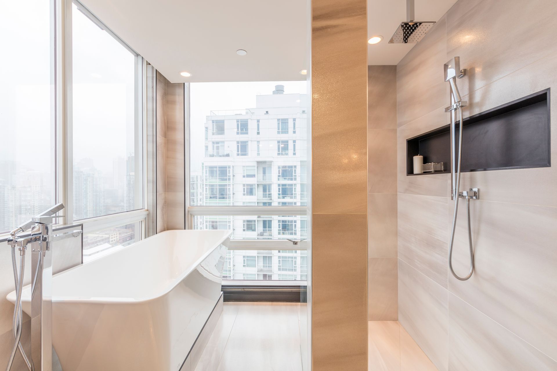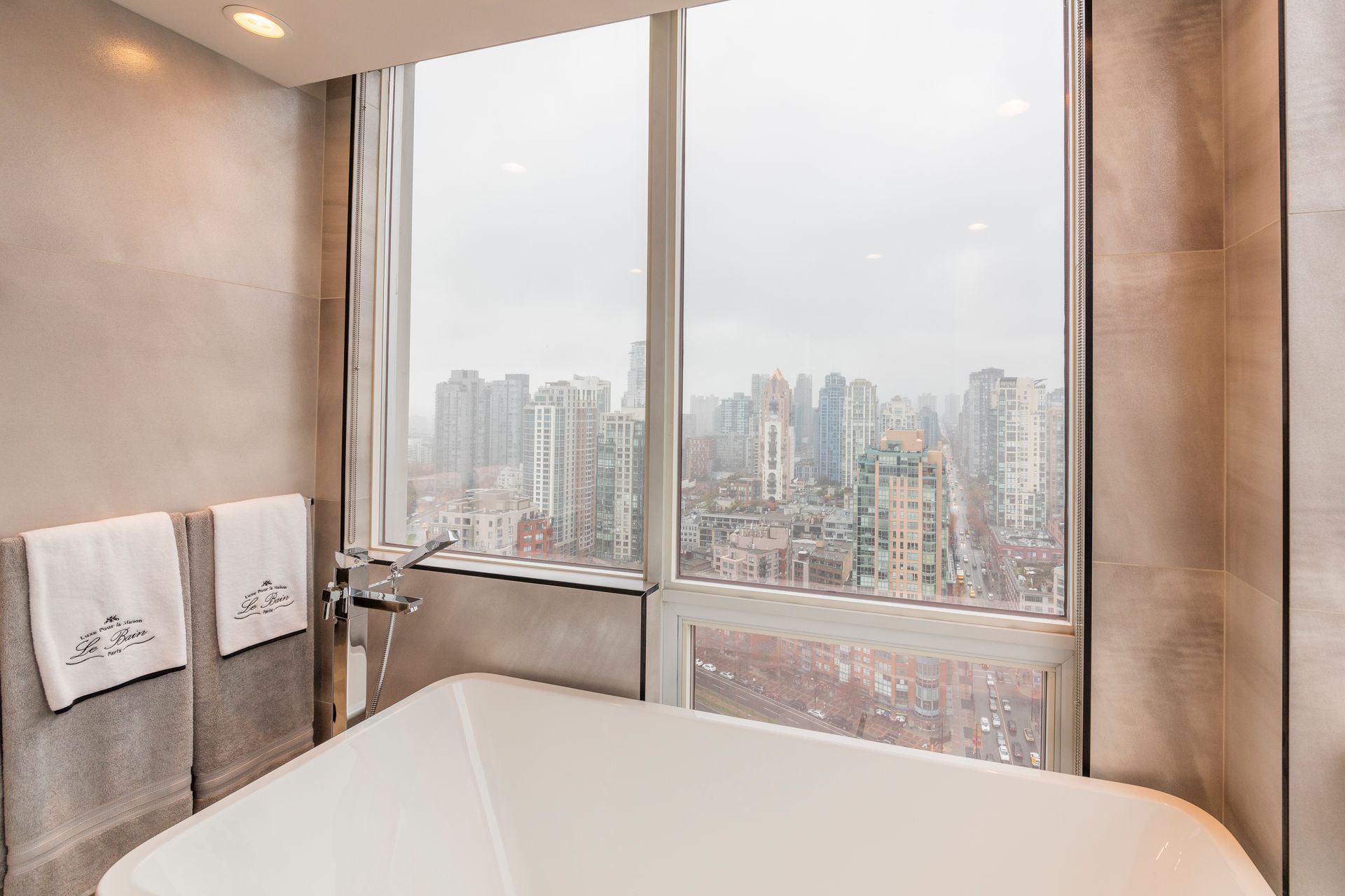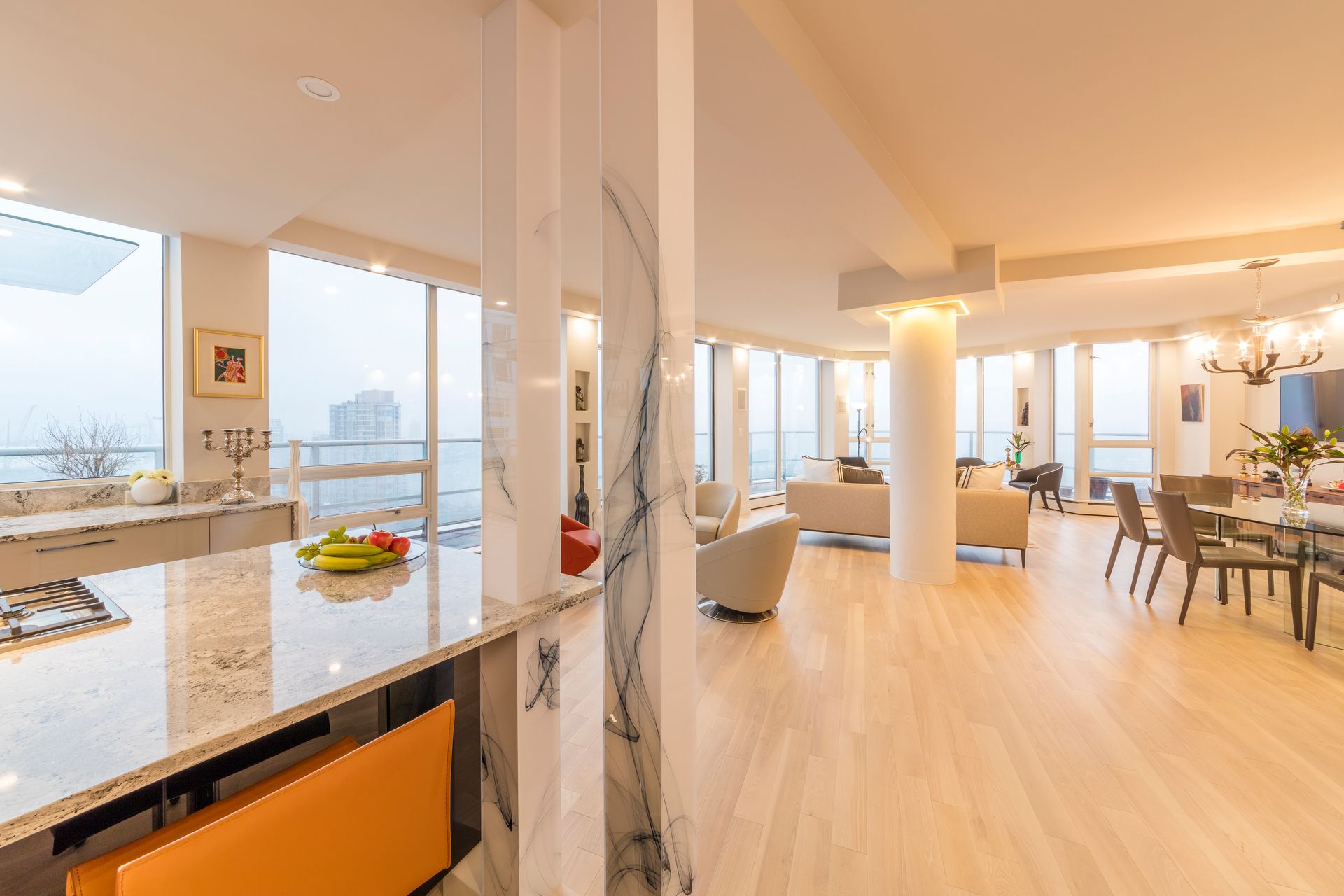 We converted the kitchen from a closed-in U shaped to an open island-style kitchen while maintaining a large kitchen nook area for food storage and preparation. The ensuite bathroom is by far the stand-out feature here. We moved the bathtub to sit directly in front of the beautiful view of Vancouver. While the black granite raised sink and the Times Square faucet makes a splash.