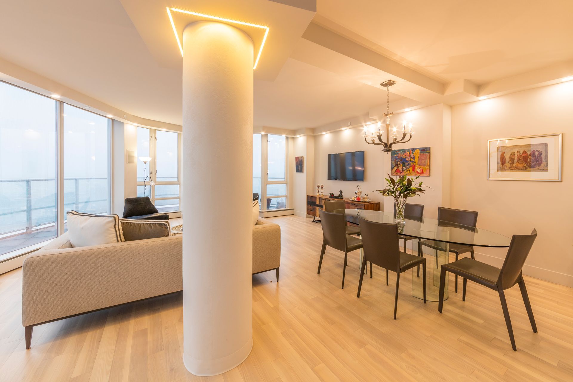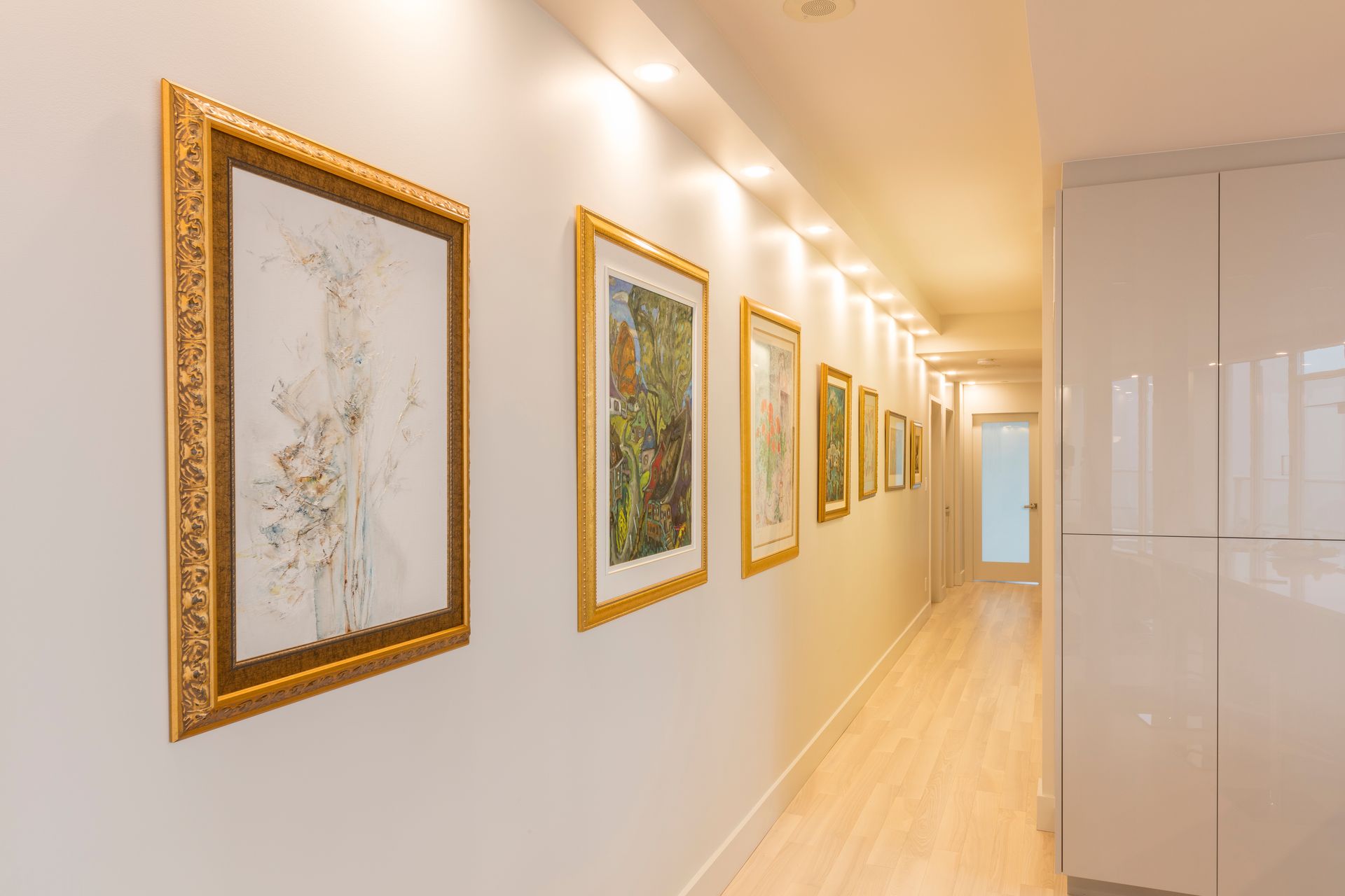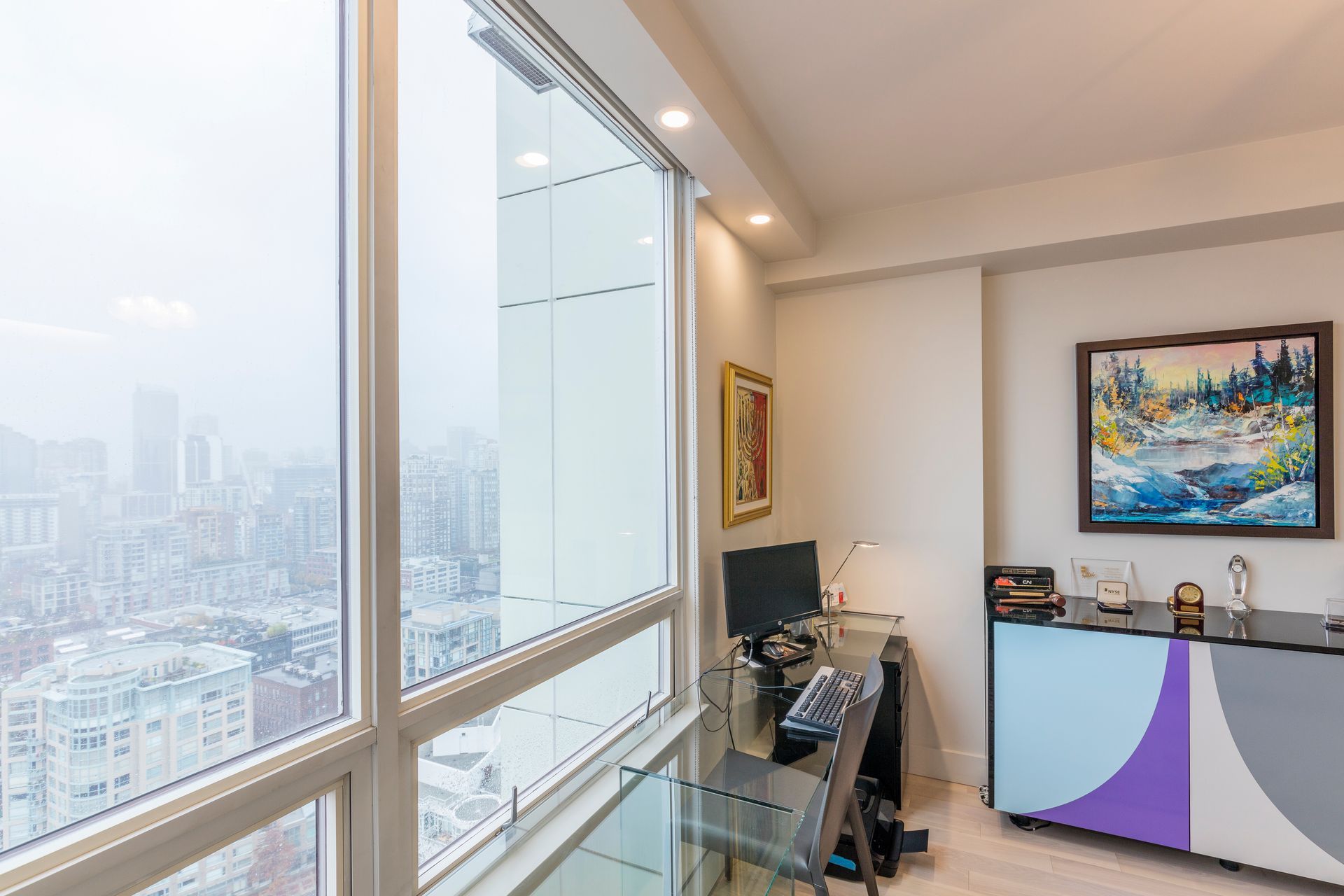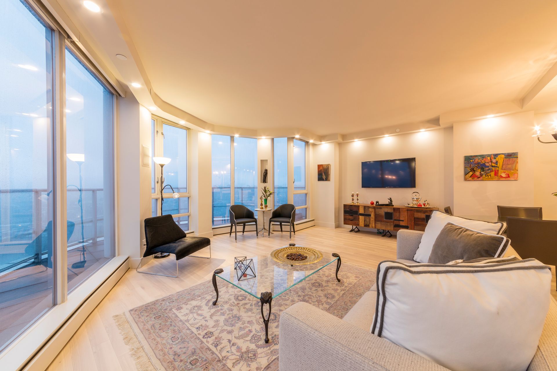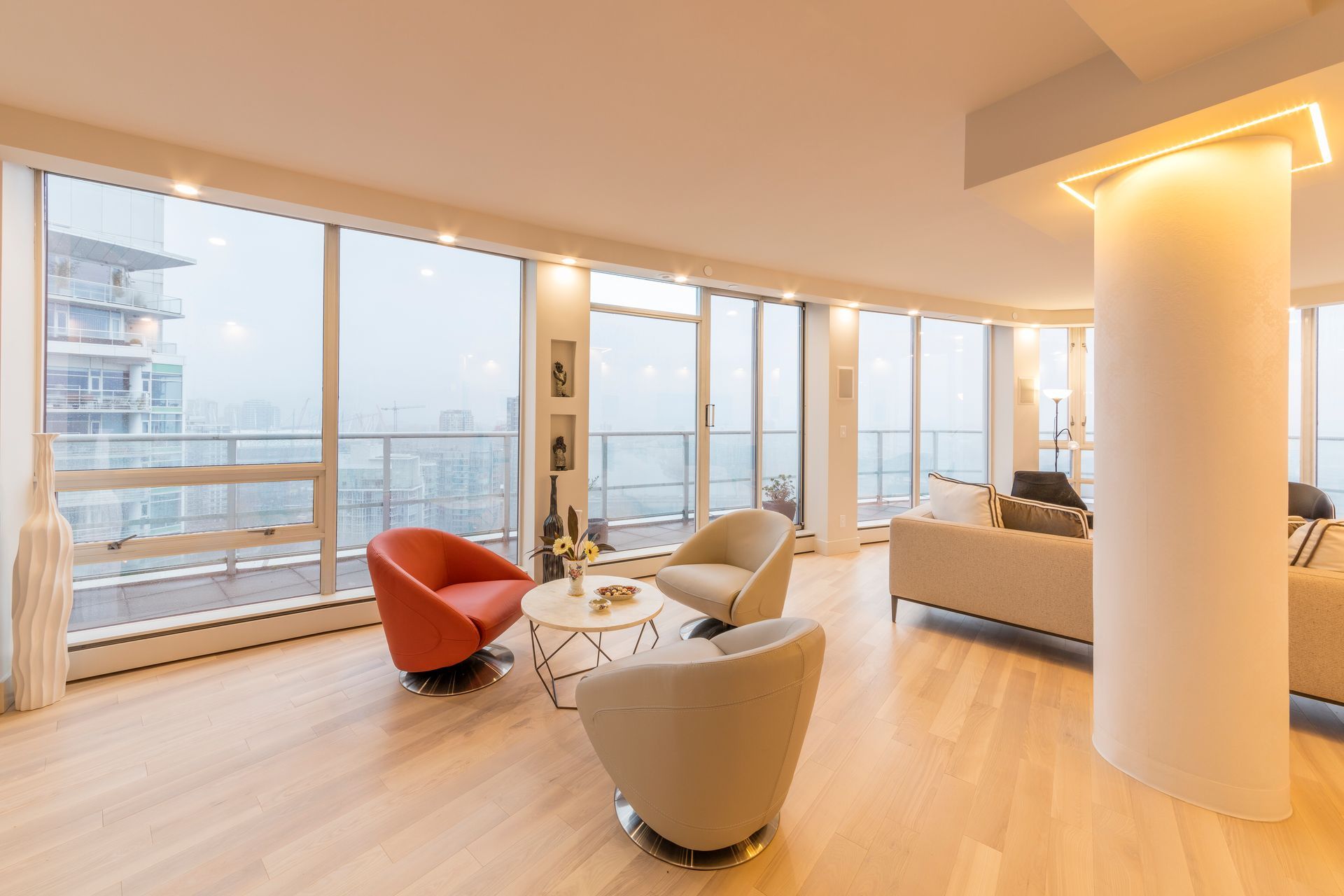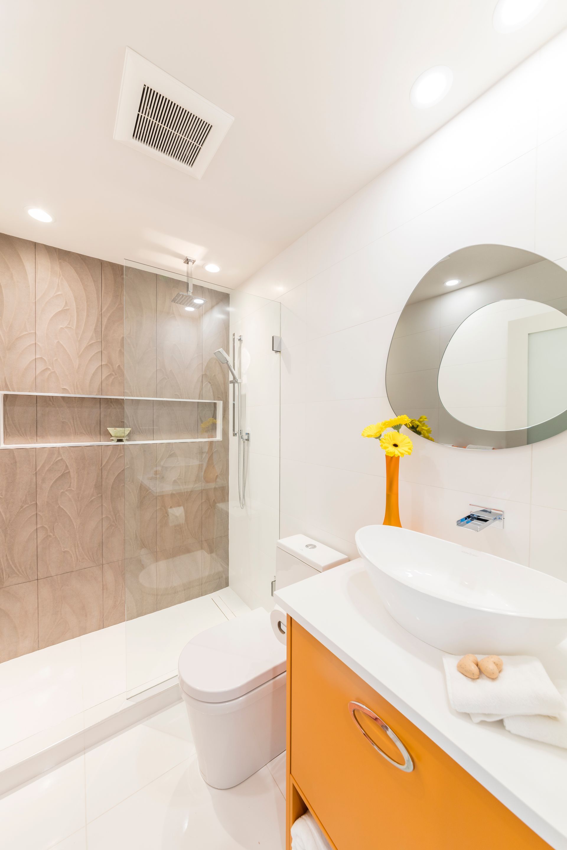 We converted the kitchen from a closed-in U shaped to an open island-style kitchen while maintaining a large kitchen nook area for food storage and preparation. The ensuite bathroom is by far the stand-out feature here. We moved the bathtub to sit directly in front of the beautiful view of Vancouver. While the black granite raised sink and the Times Square faucet makes a splash.