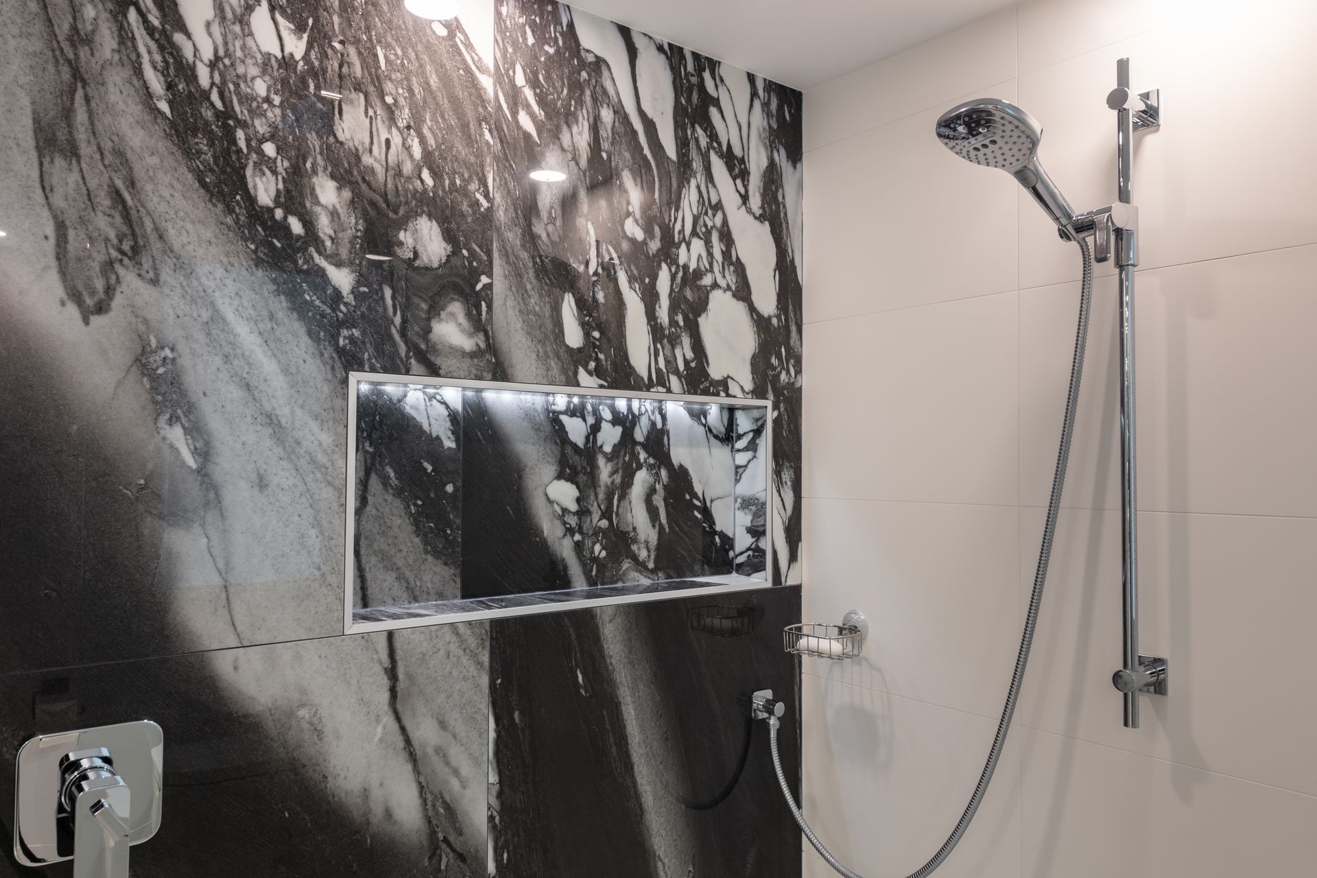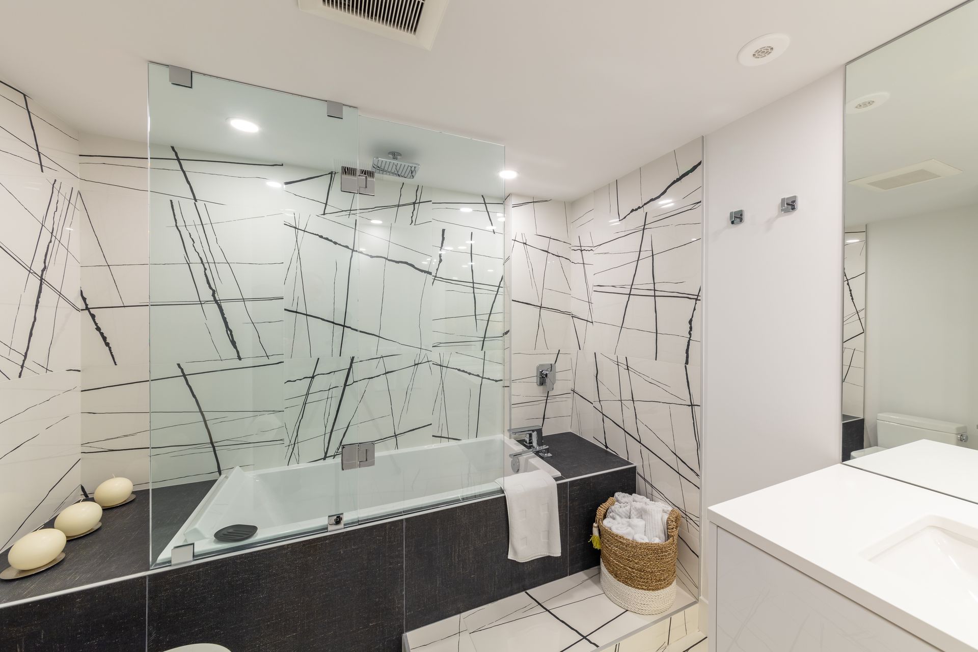 We installed a highly efficient air conditioning system that ensures the condo remains comfortable all year round. We selected Beethoven oak natural wood flooring for the living area, adding warmth and elegance to the space. The bathroom is equally stunning, with Calcatta Renoir tiling that is sure to impress. Overall, this condo renovation is a true award-winning masterpiece, showcasing the best in modern design and functionality.