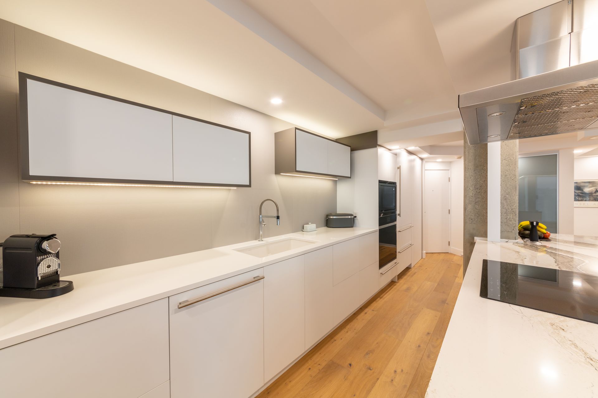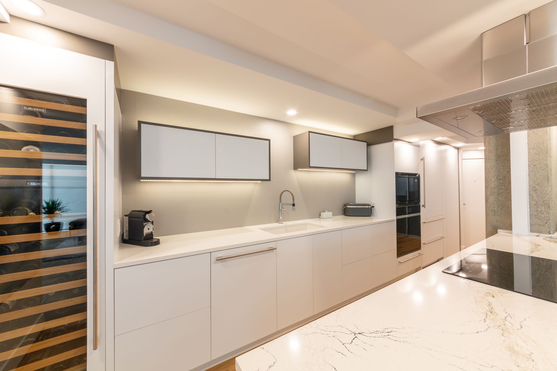 One of the standout features of this kitchen renovation is the LED strip lighting that lines the various elements in the millwork in the kitchen, making the millwork pop out.