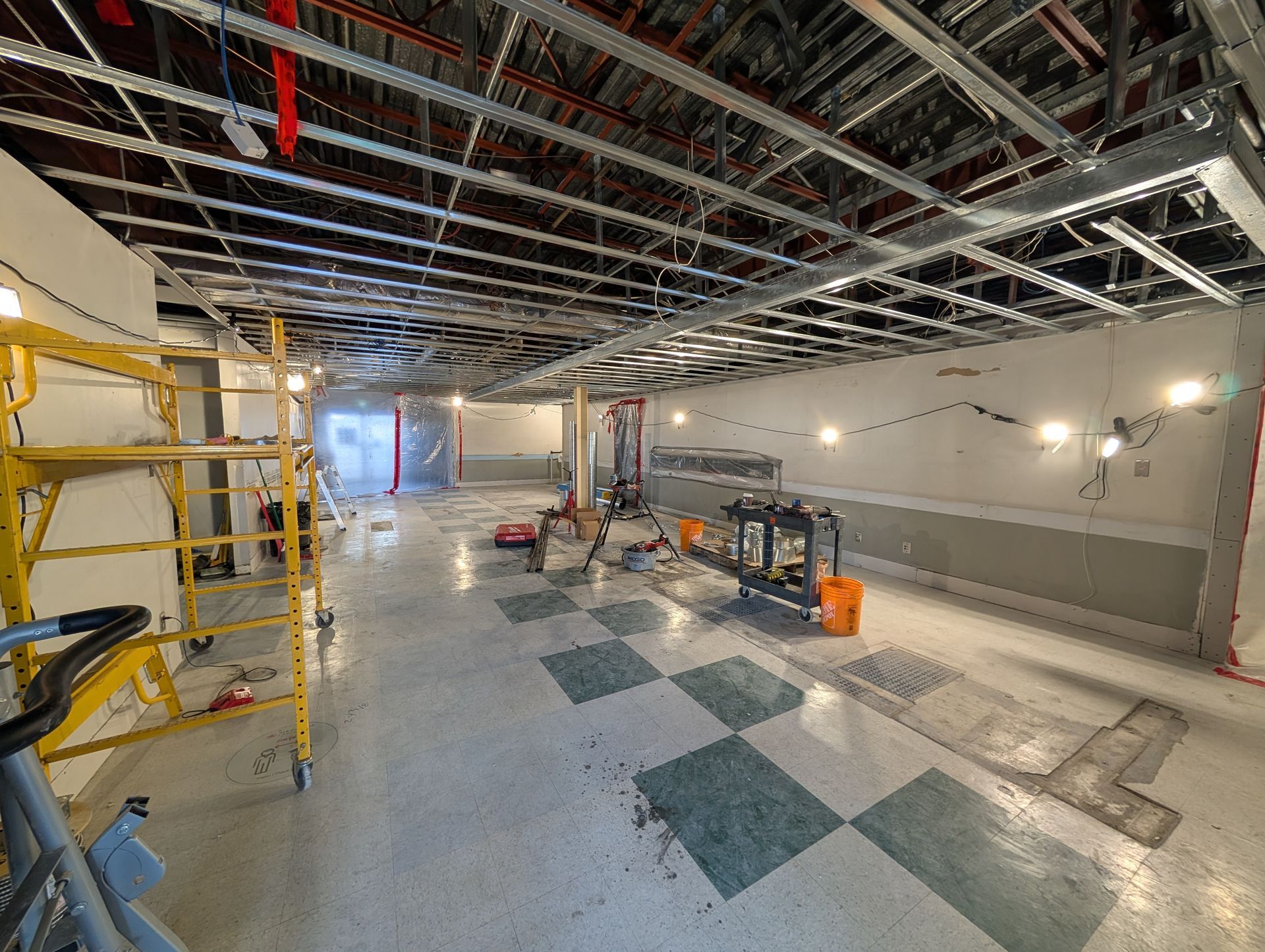Eventually with a greenlight, we started the build process. We stripped down the ceiling to raise the ceiling height, demolished all the existing millwork and worked through all the various elements, electrical, mechanical, flooring, drop ceiling and drywall to achieve the design.