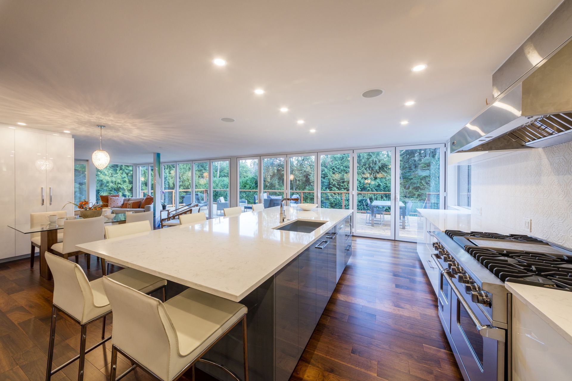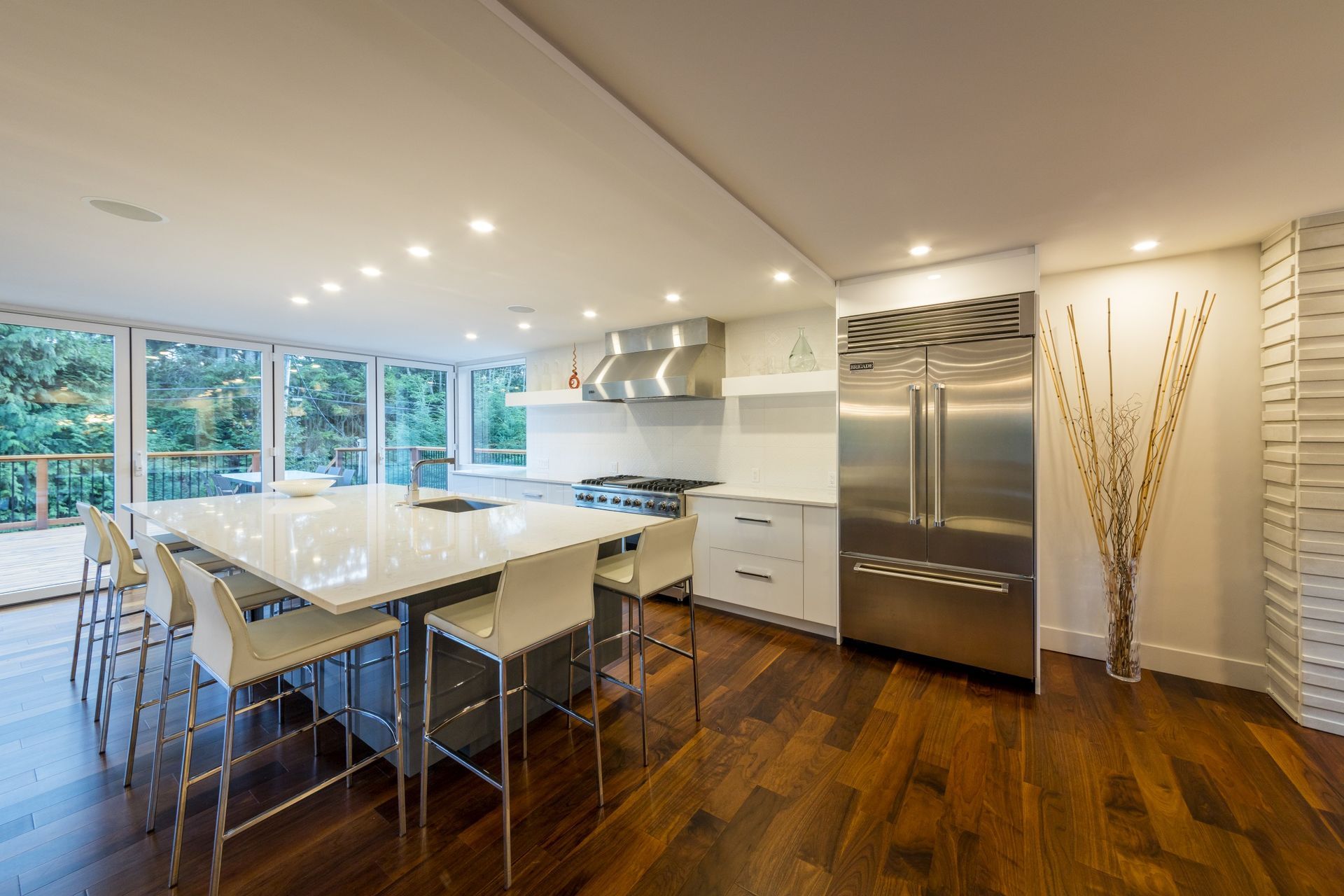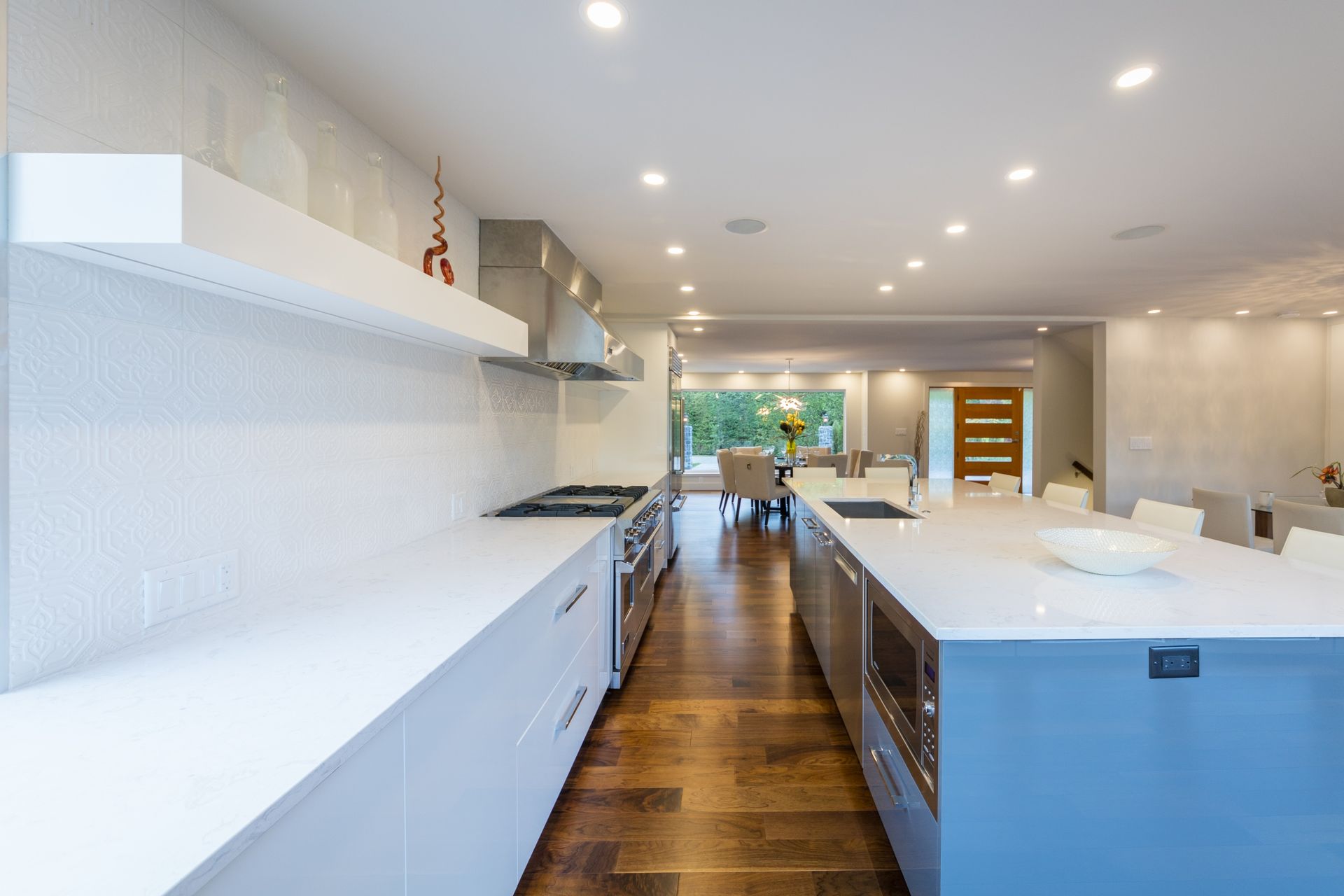 No element went untouched with the design and build of this kitchen with the use of Cambria quartz countertops and LED strip lighting, while the full-height backsplash adds height to this space.