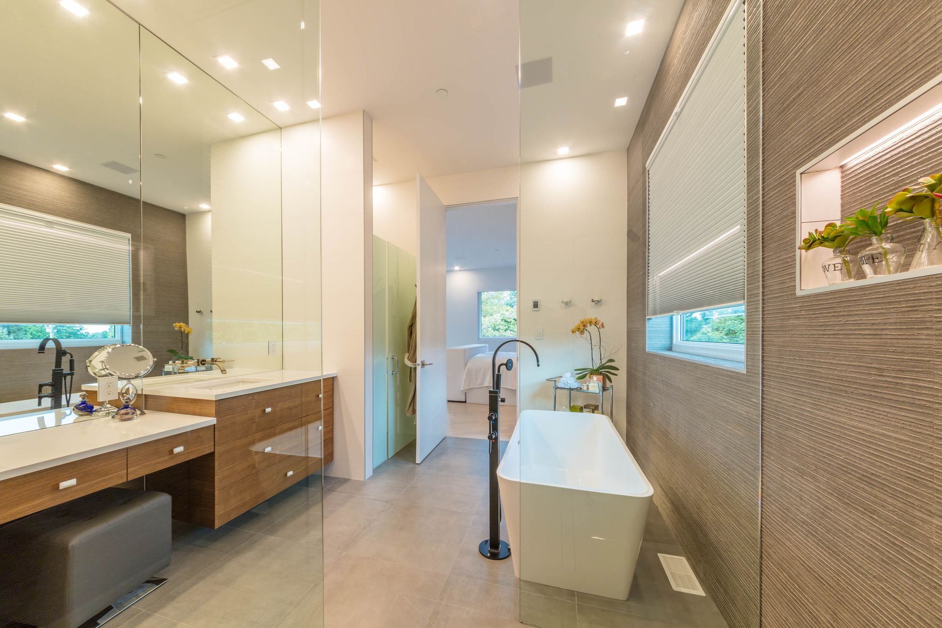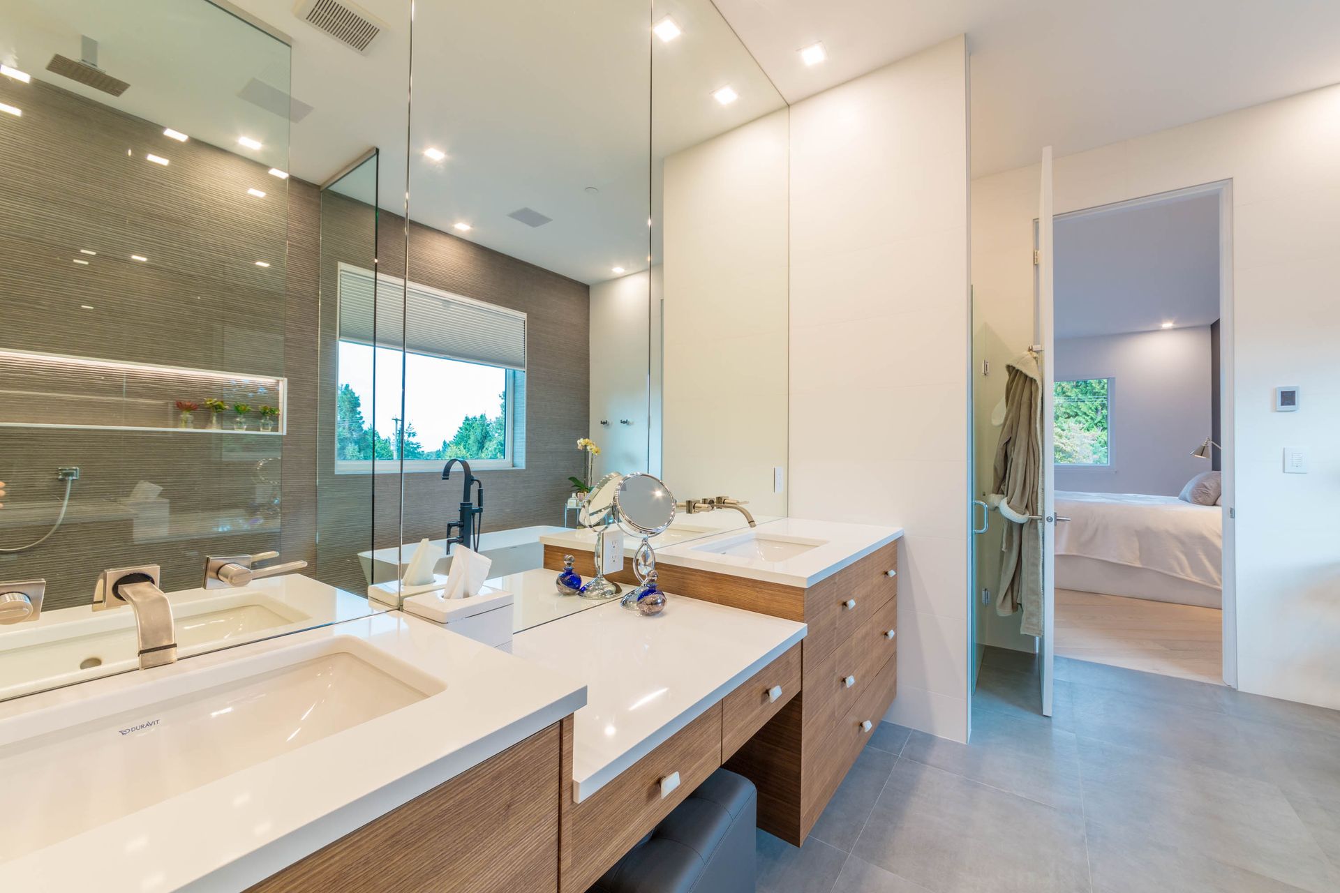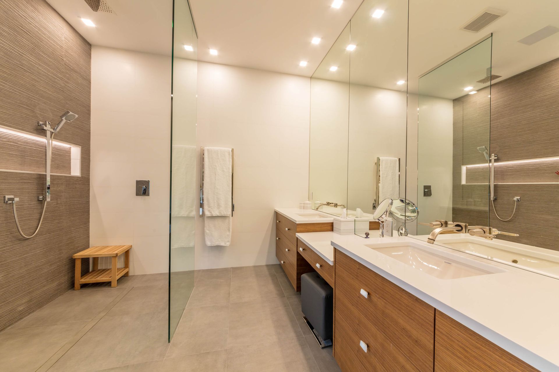 We designed this walk-through bathroom ensuite for two with double vanity sinks, mirrors, and even a two-way access walk-in shower. The adjacent make-up vanity is not only functional, but the floor-to-ceiling mirror amplifies the room's spaciousness.