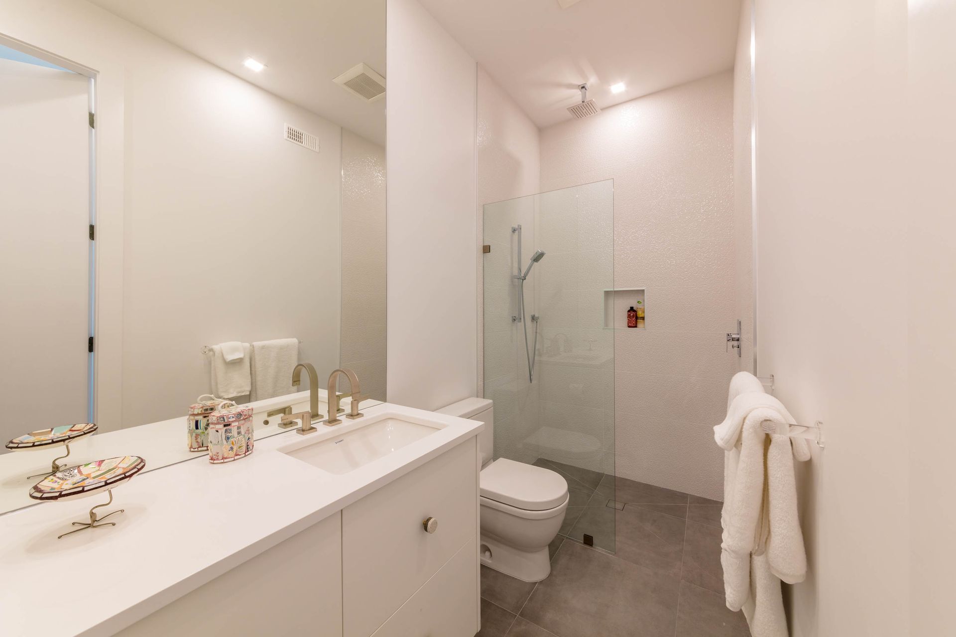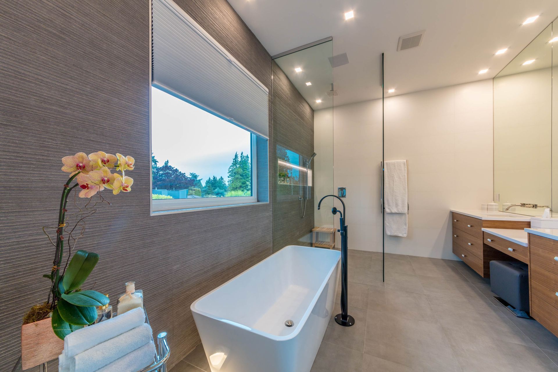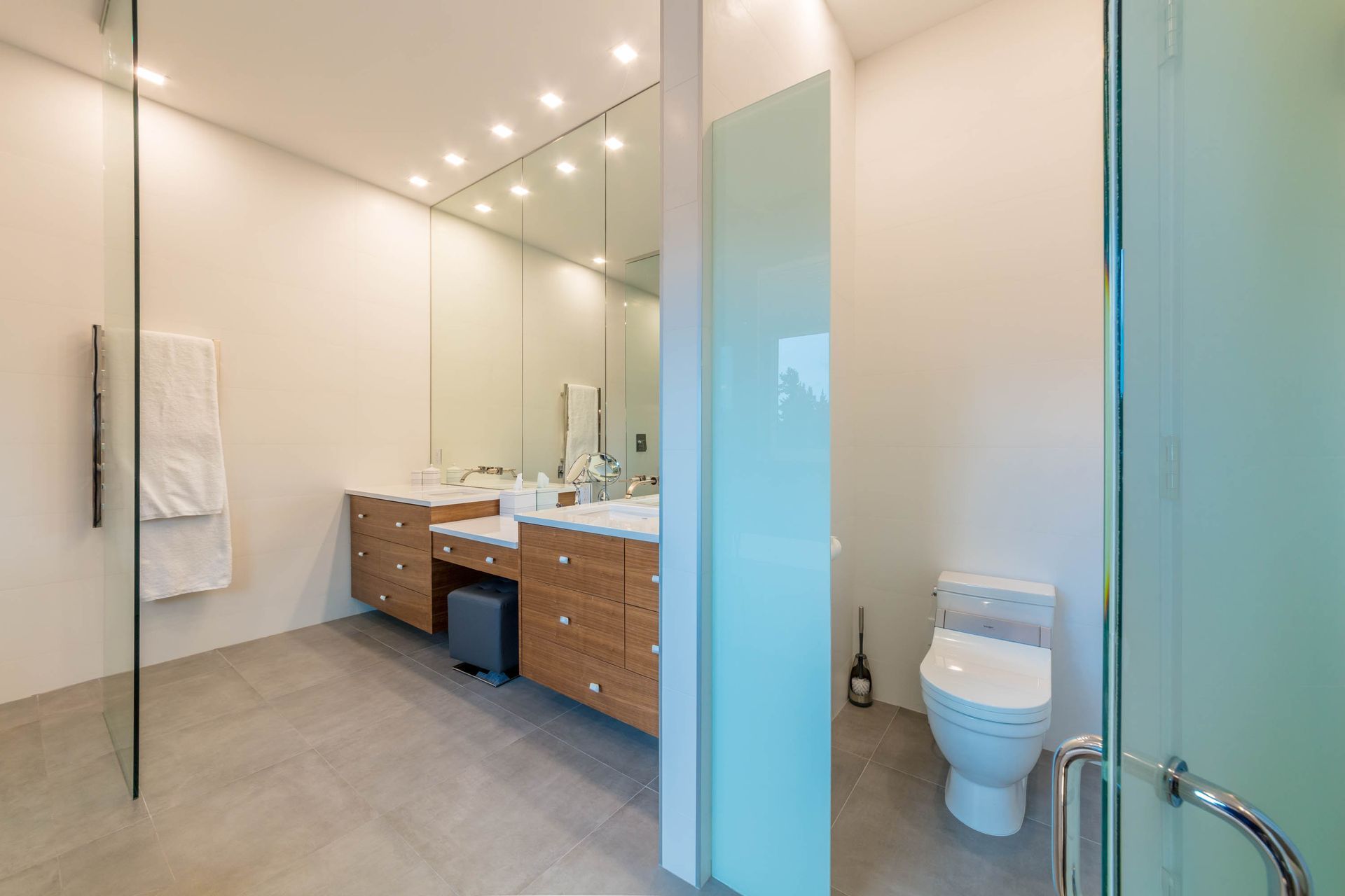 We designed this walk-through bathroom ensuite for two with double vanity sinks, mirrors, and even a two-way access walk-in shower. The adjacent make-up vanity is not only functional, but the floor-to-ceiling mirror amplifies the room's spaciousness.