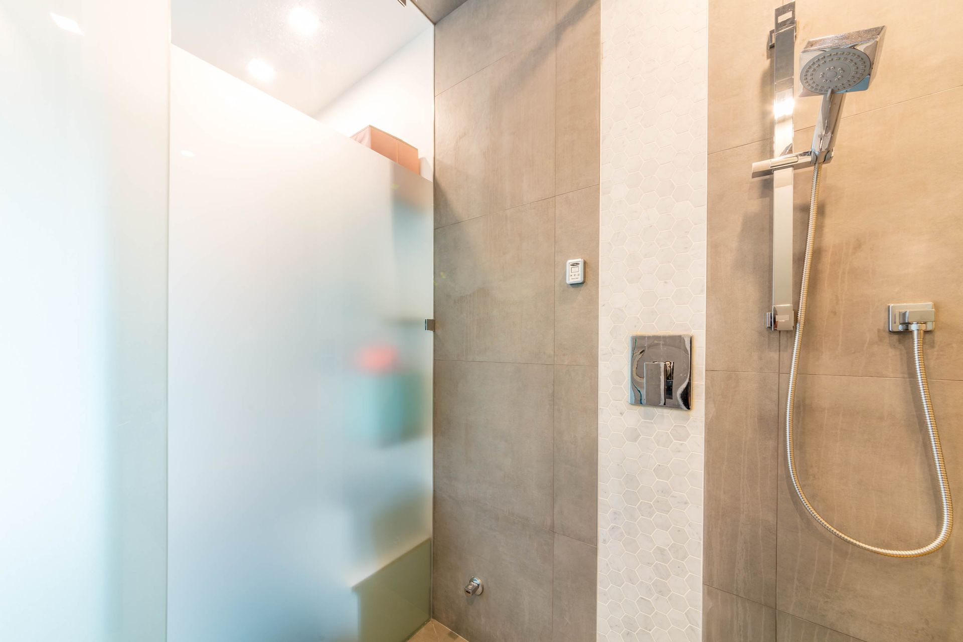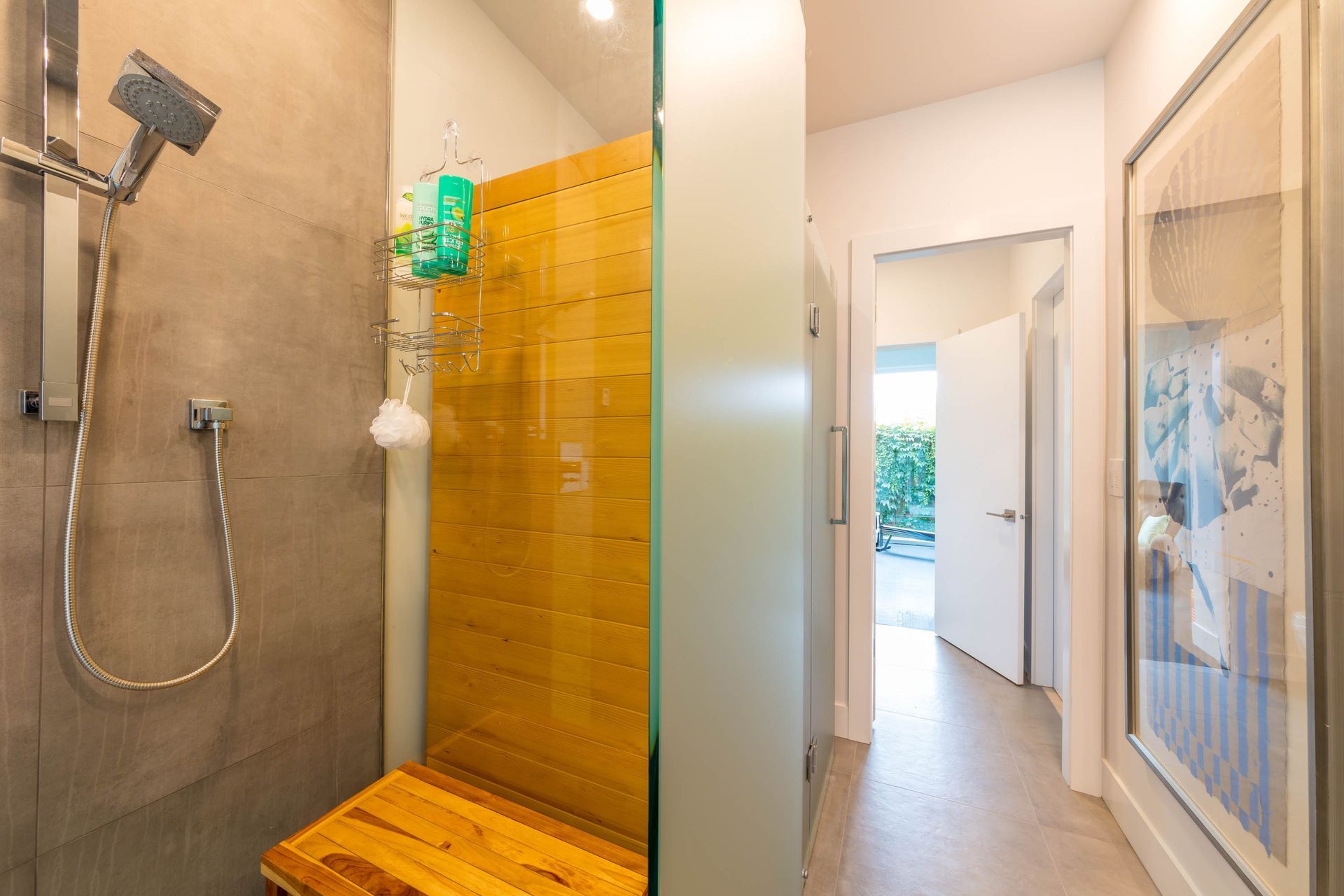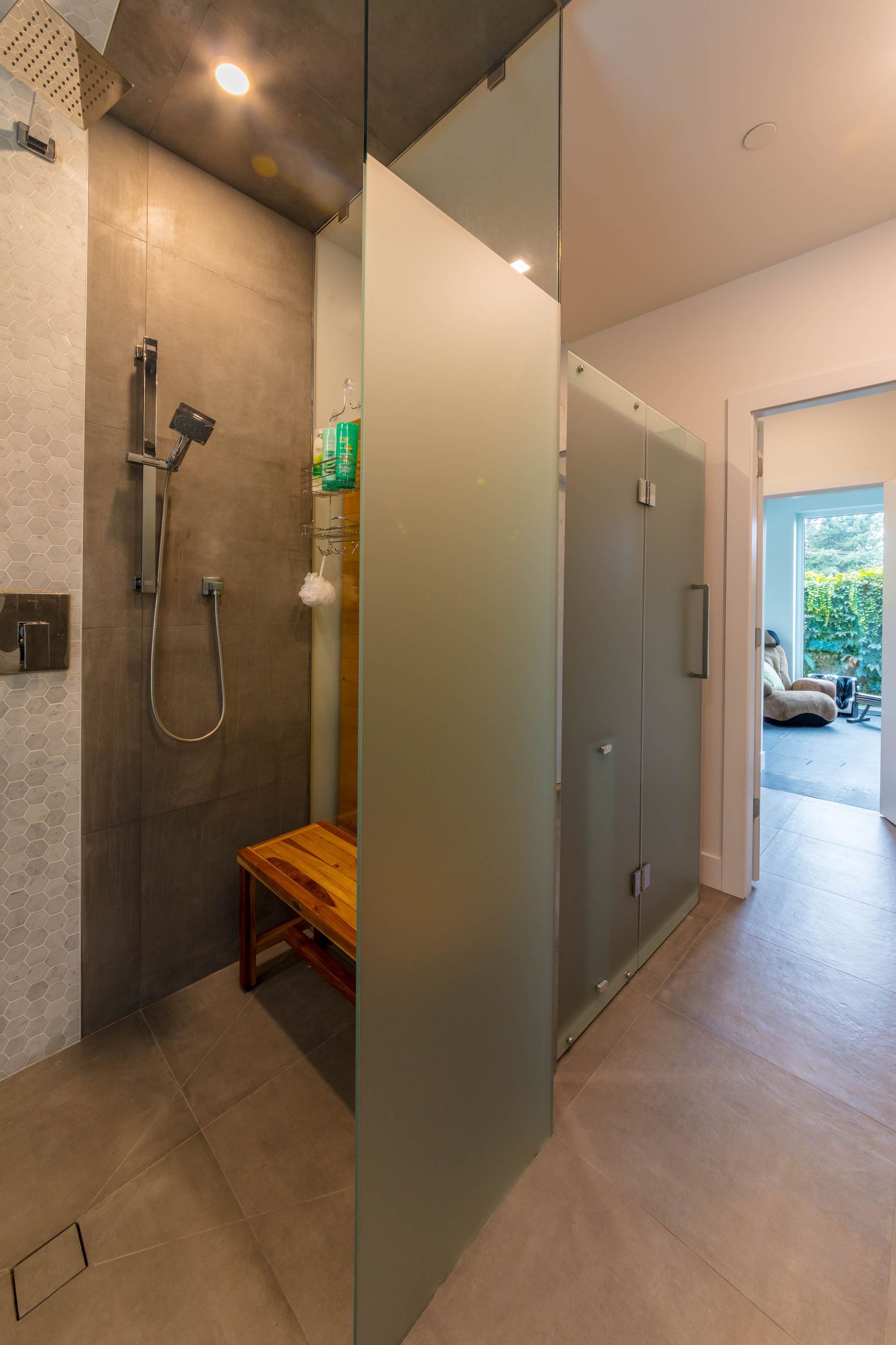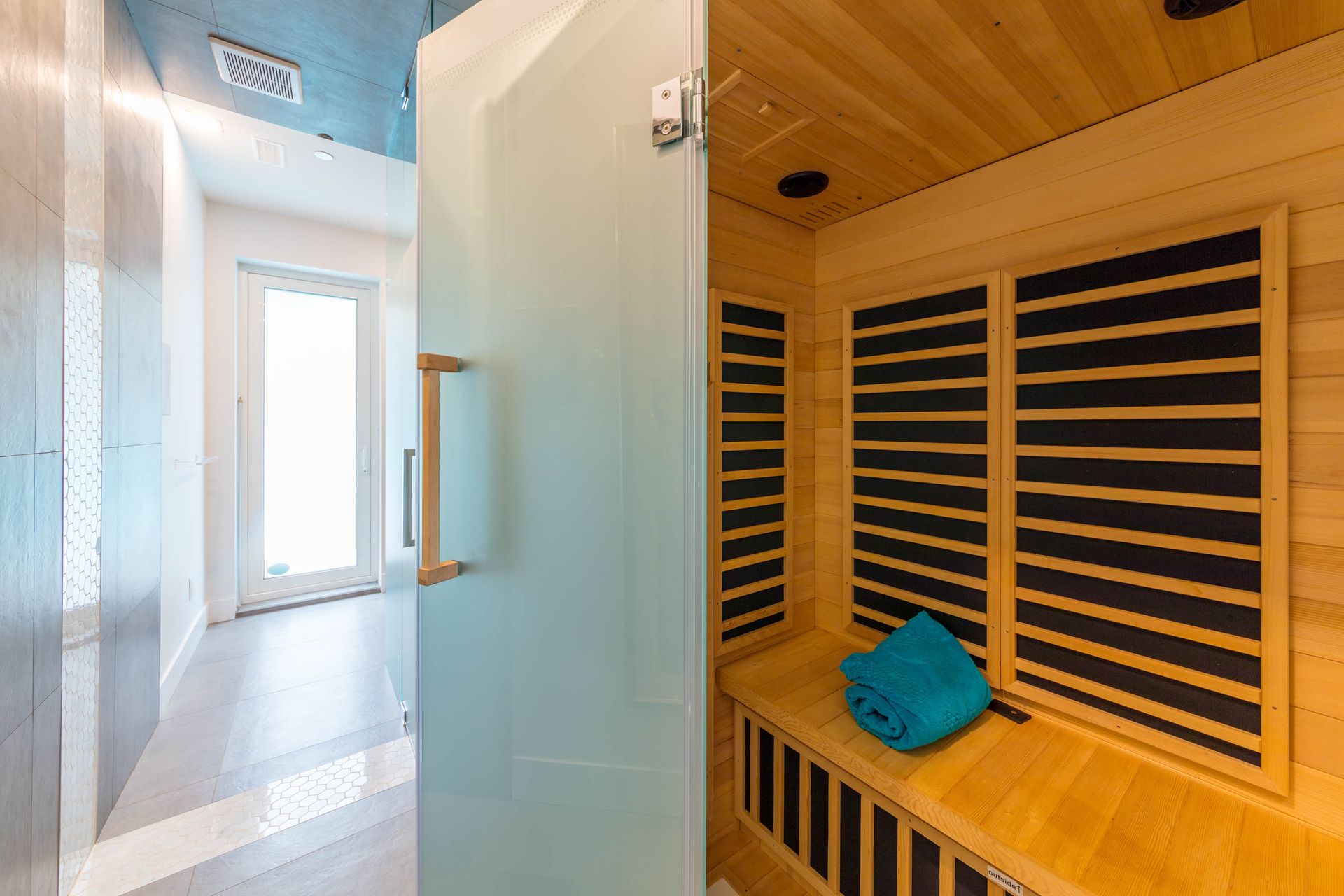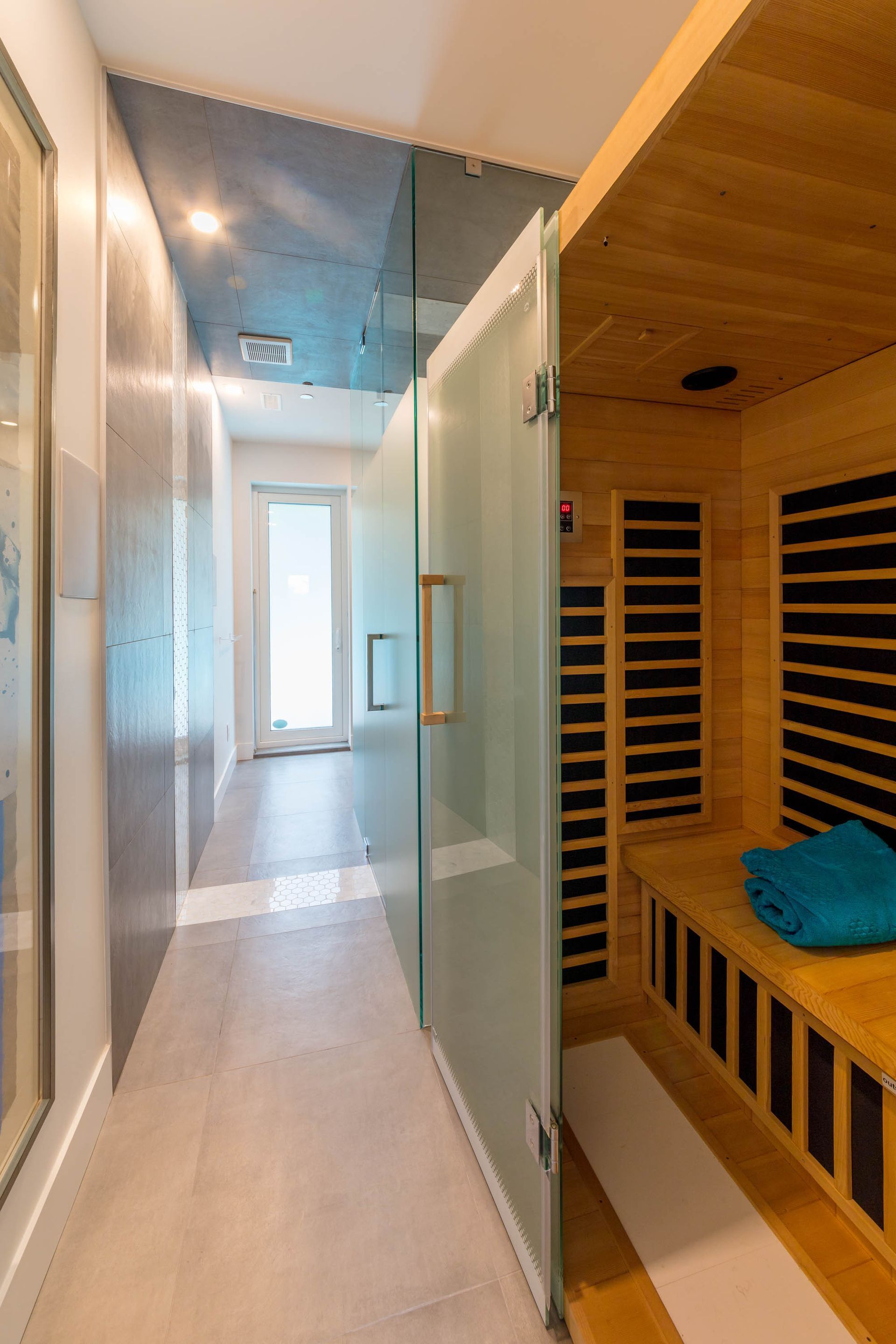 Downstairs the home features a luxury spa design with a Scandinavian shower and sauna. This spa area also doubles as access to and from home for the impressive outdoor pool that highlights this beautiful home.