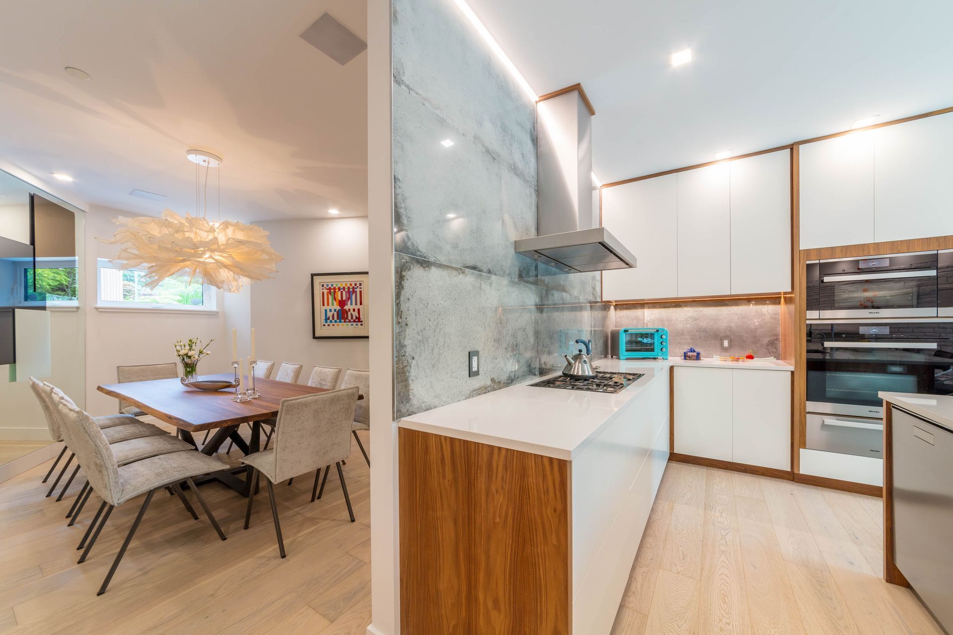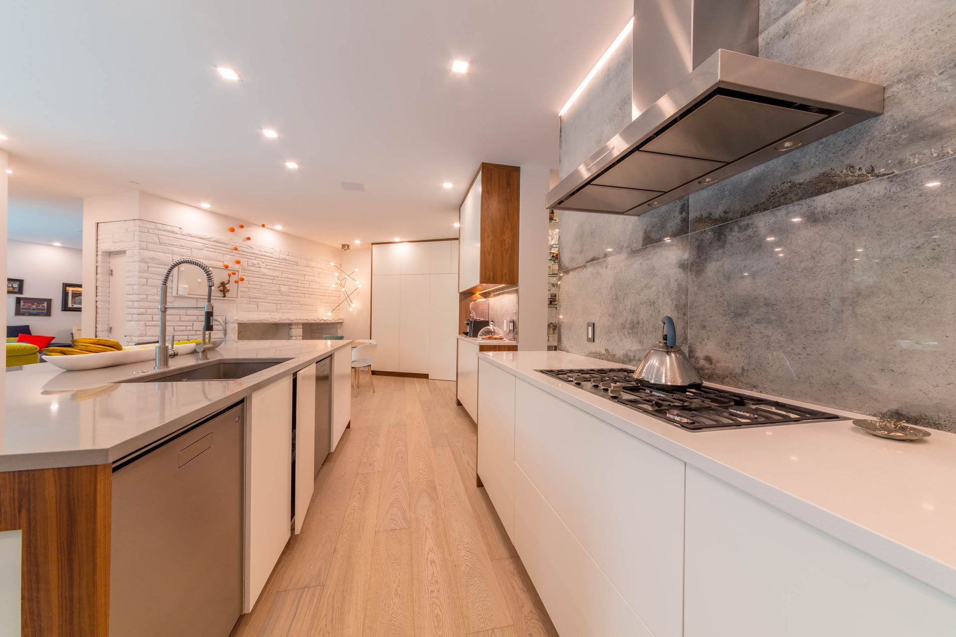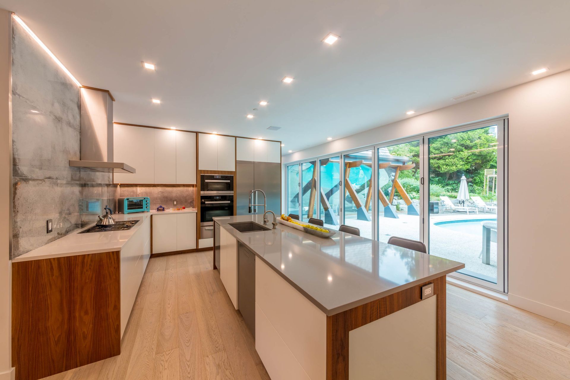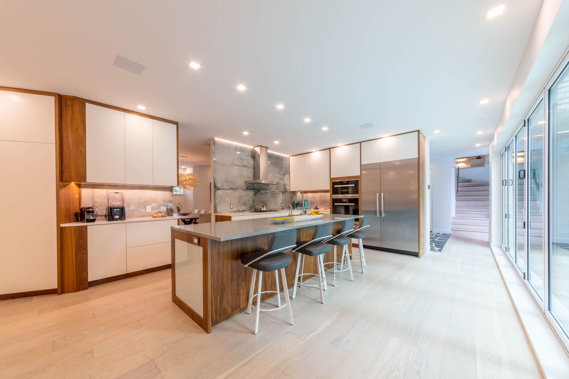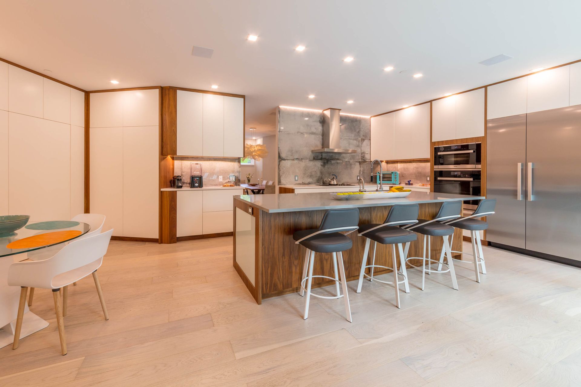 Accent under-cabinet LED strip lighting enhances the unique concrete backsplash and creates an understated architectural feature.