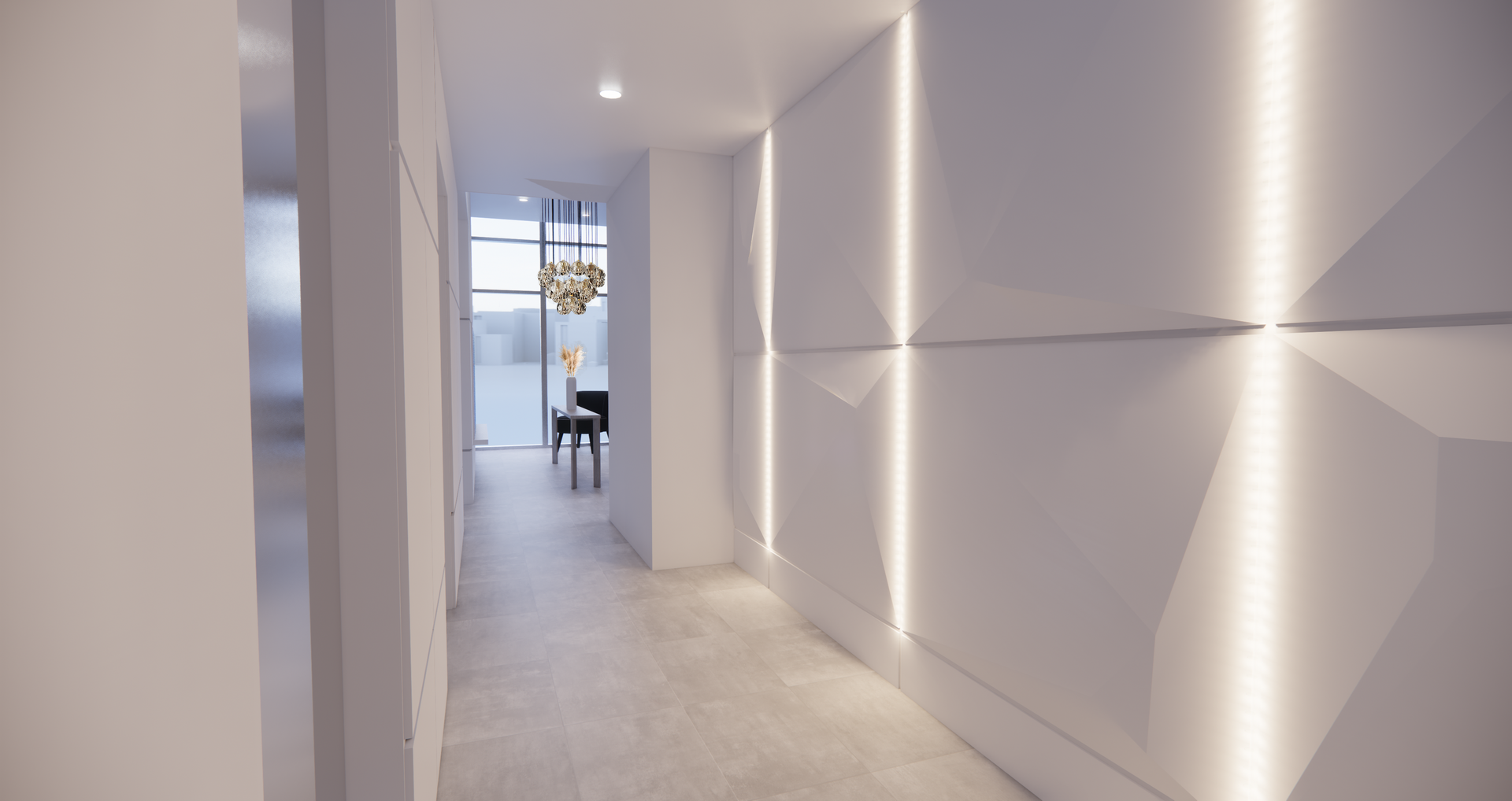 We combined sizeable art and extensive geometric tiling to capture a sense of scale, especially with these tall ceiling spaces. Our highlight is a steel train track with a specialized LED lighting strip that shines a narrow strip on the adjacent wall space.
