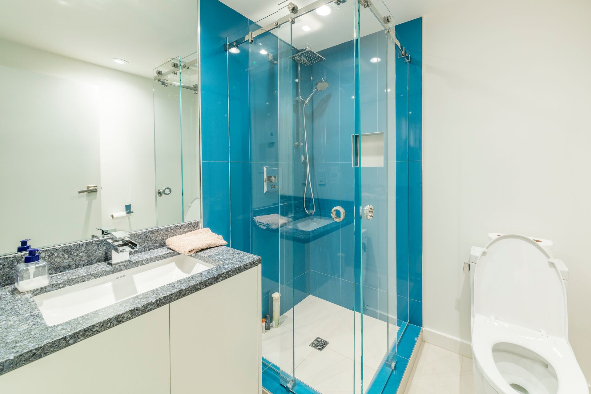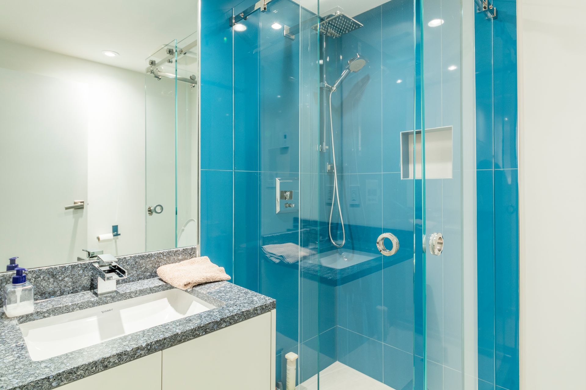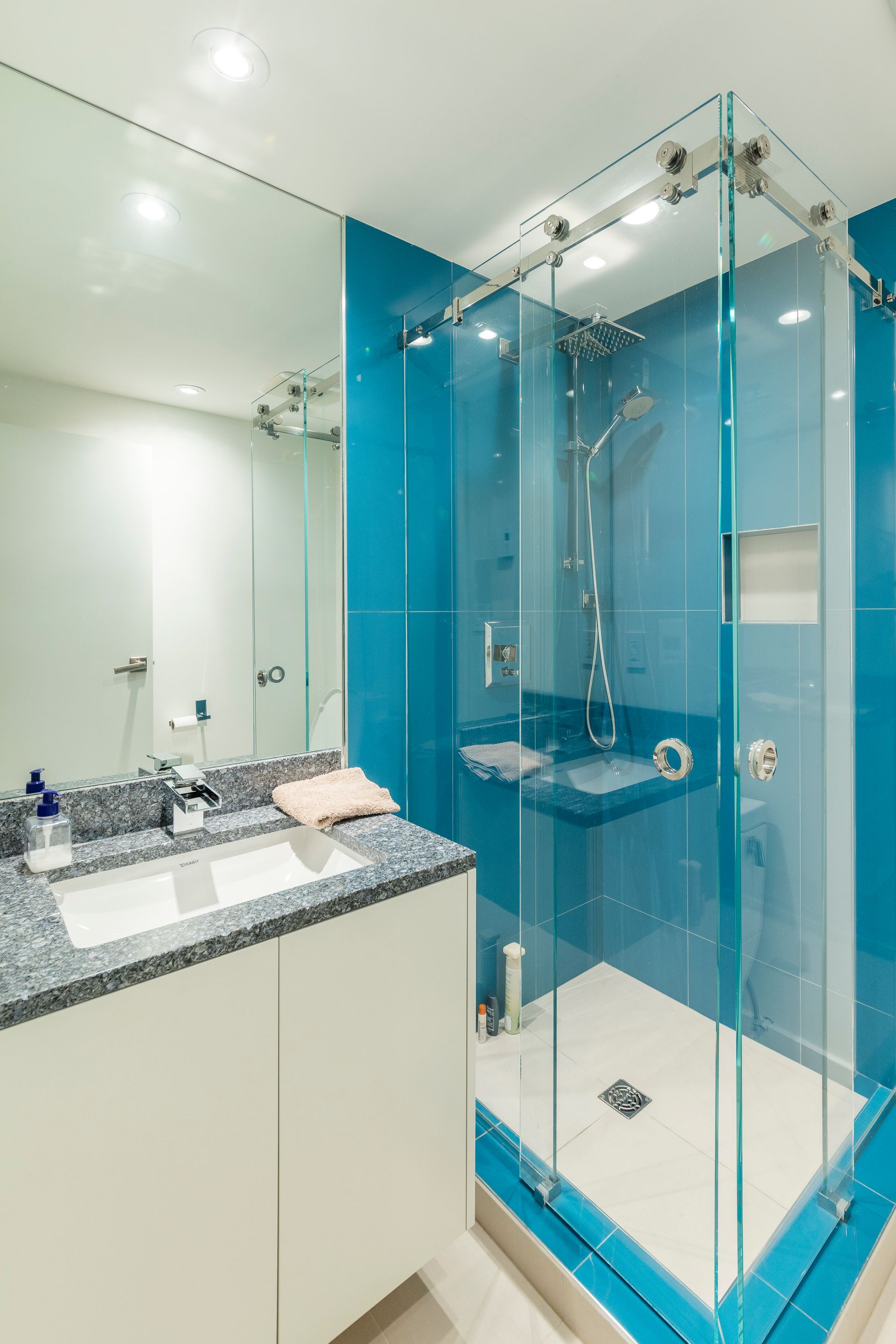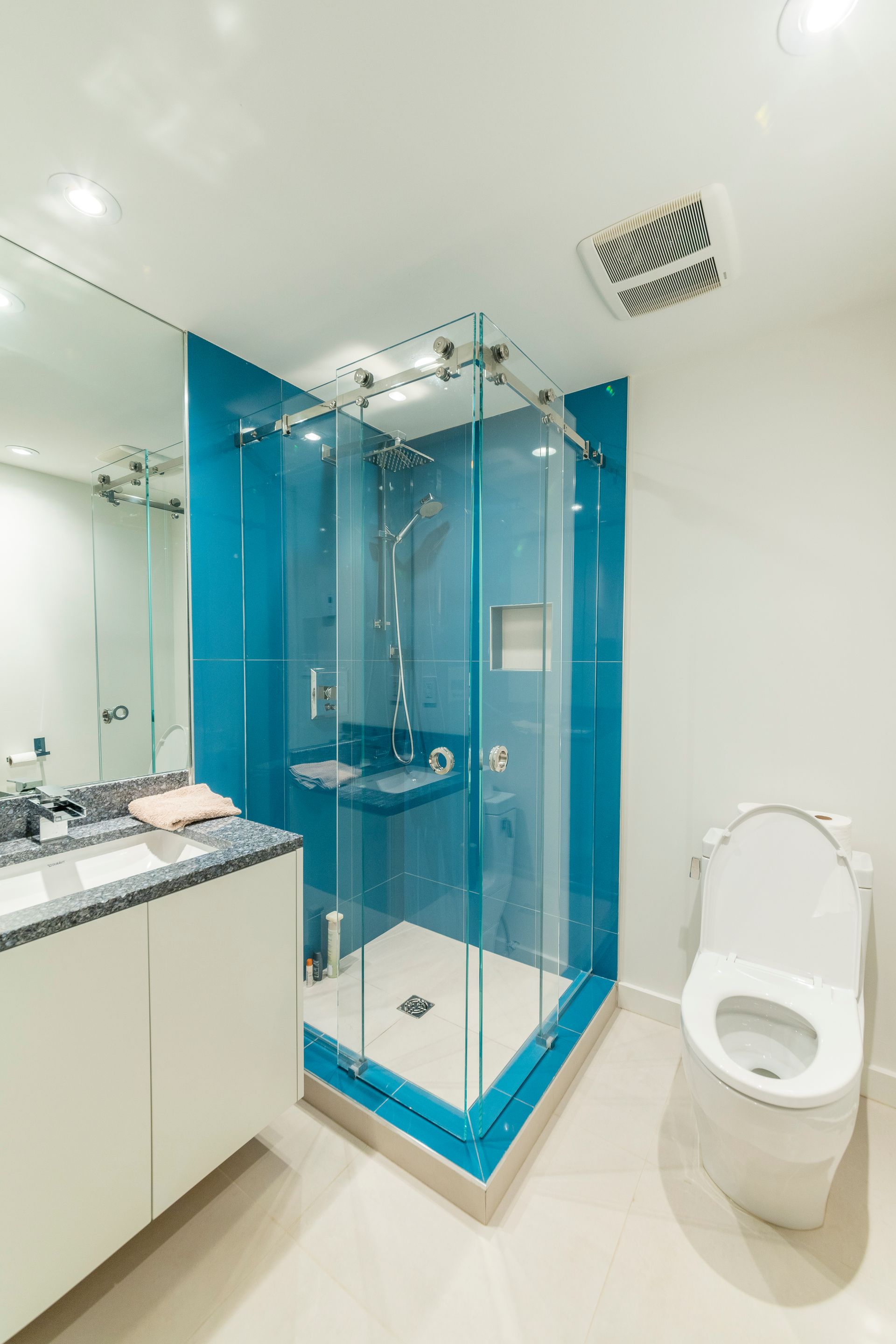 We completed these two opposite bathroom designs as part of our award-winning Granville Street home renovation. One a dark and dramatic, the other bright and blue. Our master bathroom features a dark grey river-shaded tile with contrasting polished white millwork. The other bathroom is fresh and invigorating with a white and blue colour scheme.
