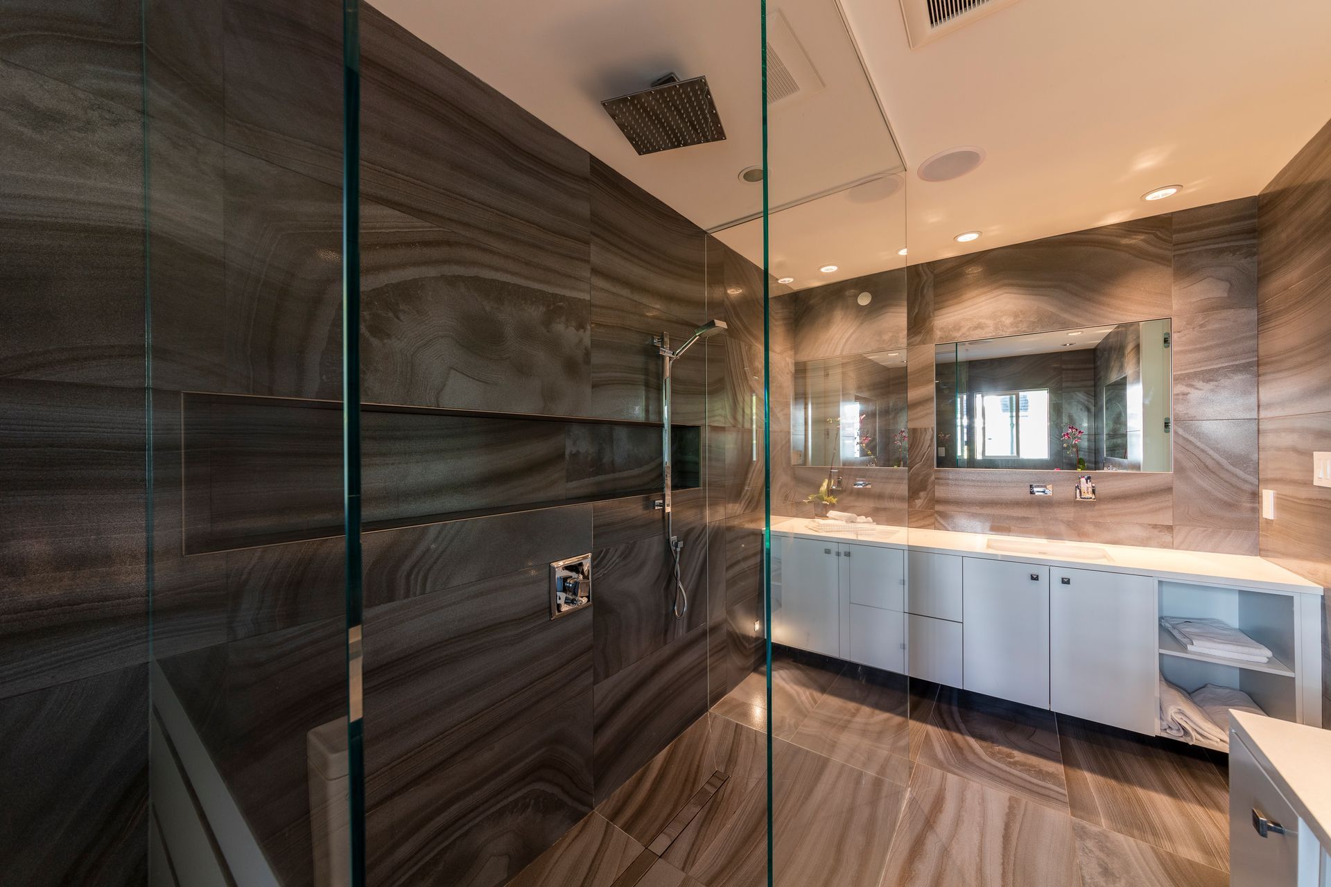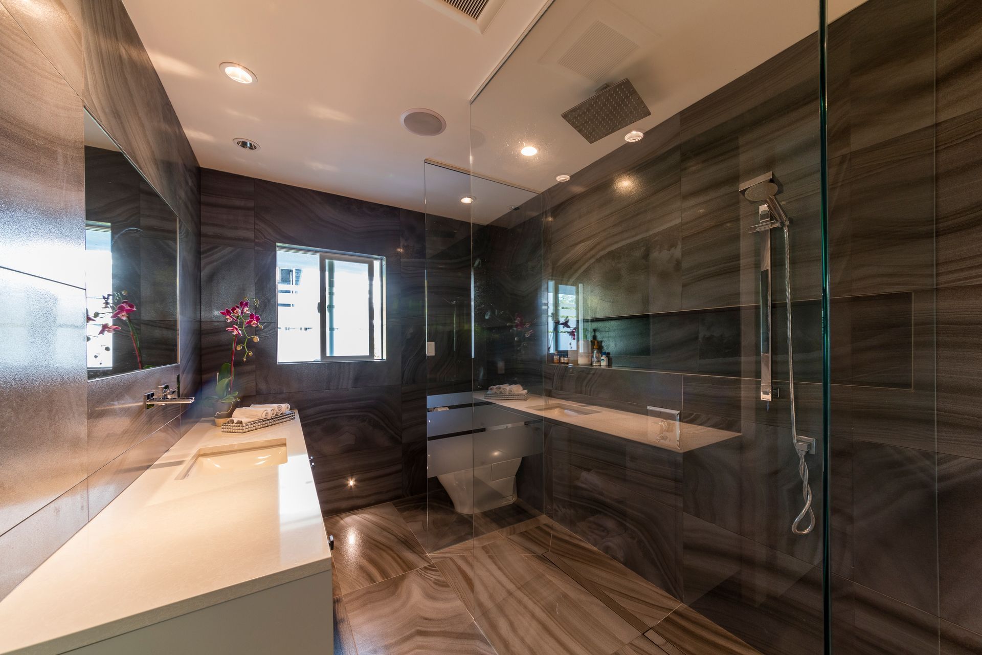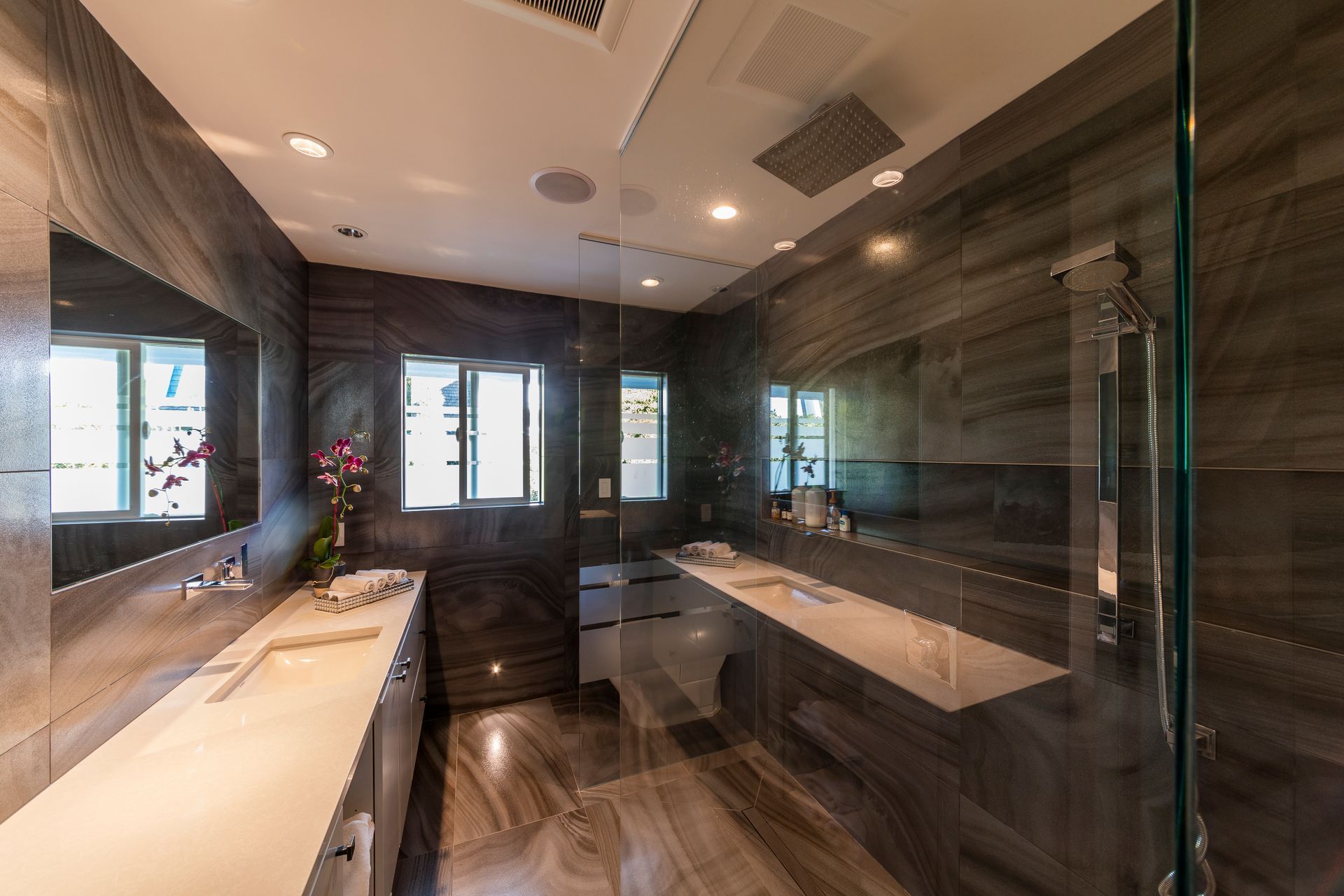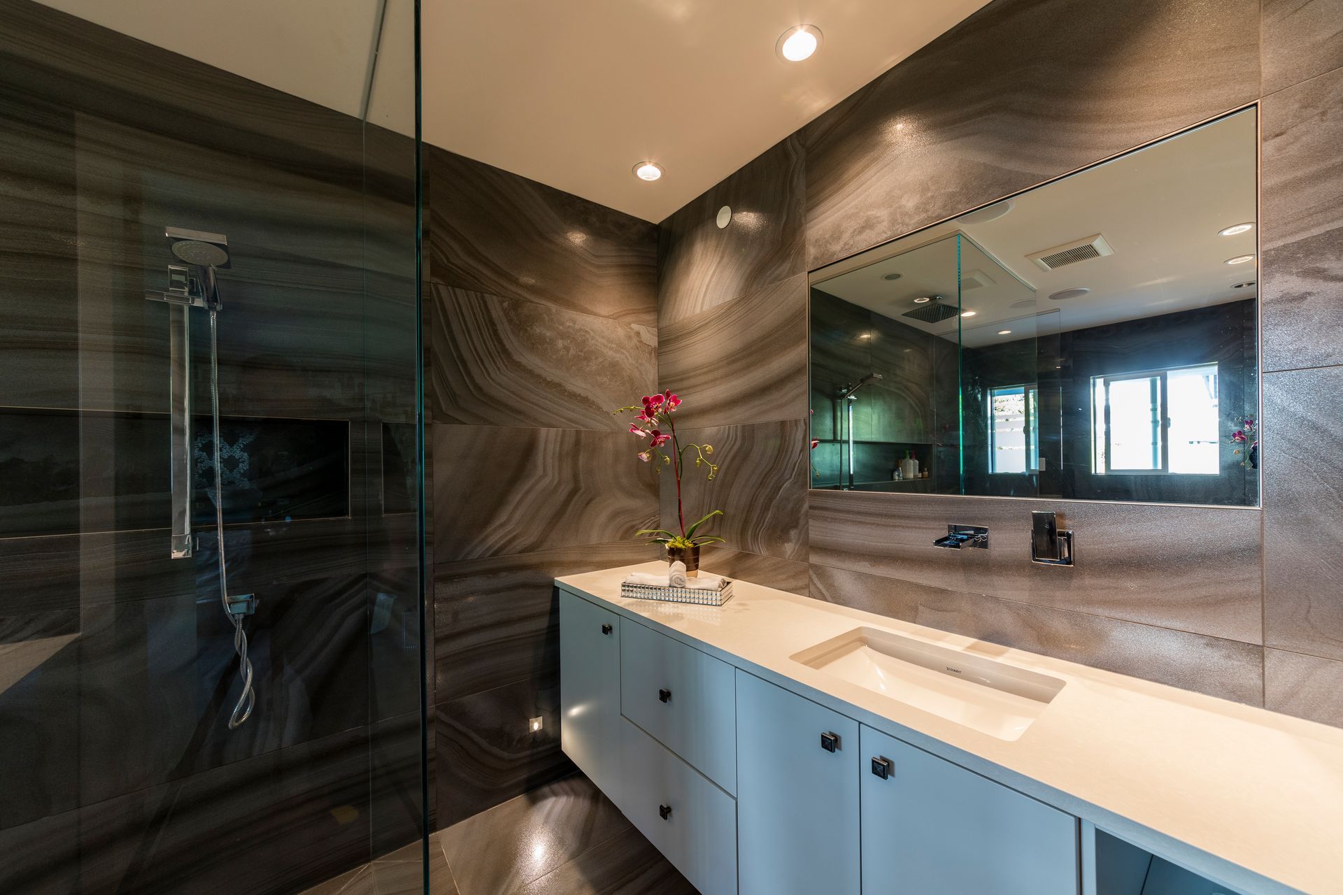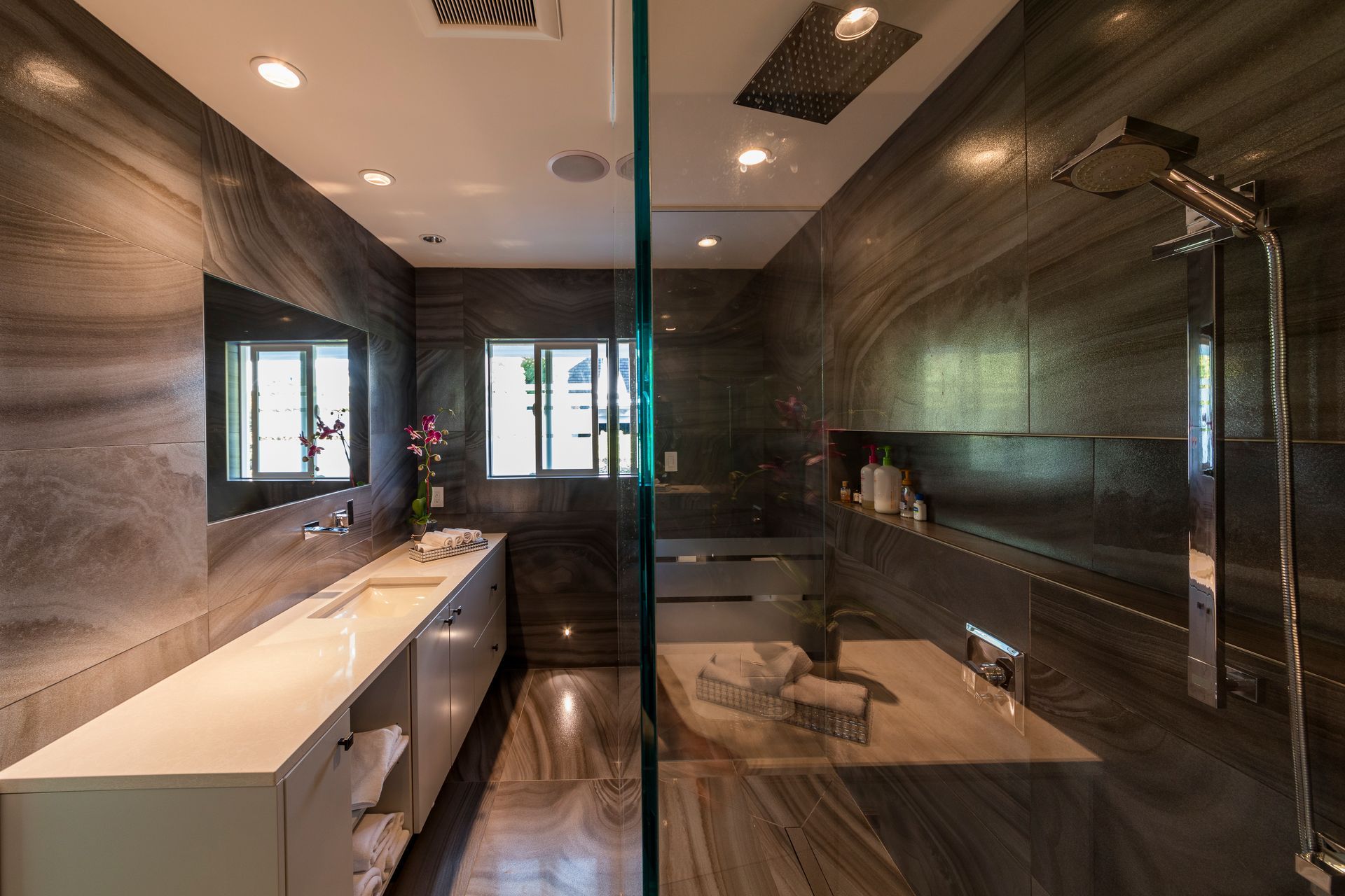 Both bathrooms feature updated environmental technology, replacing water heating with energy-efficient units and designing our bathroom lighting with new LED bulbs and fixtures.