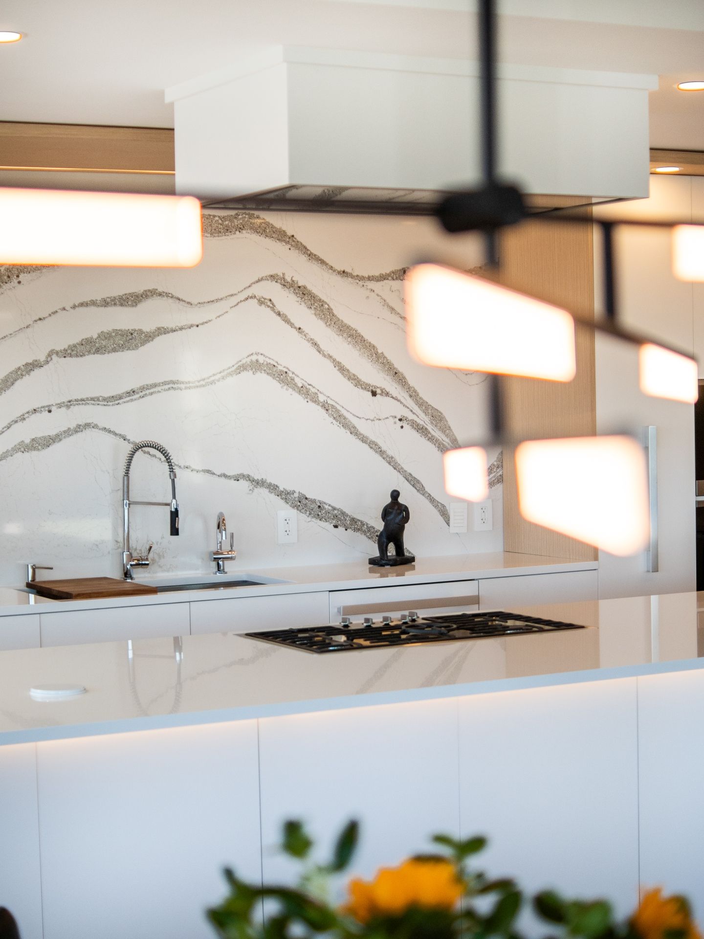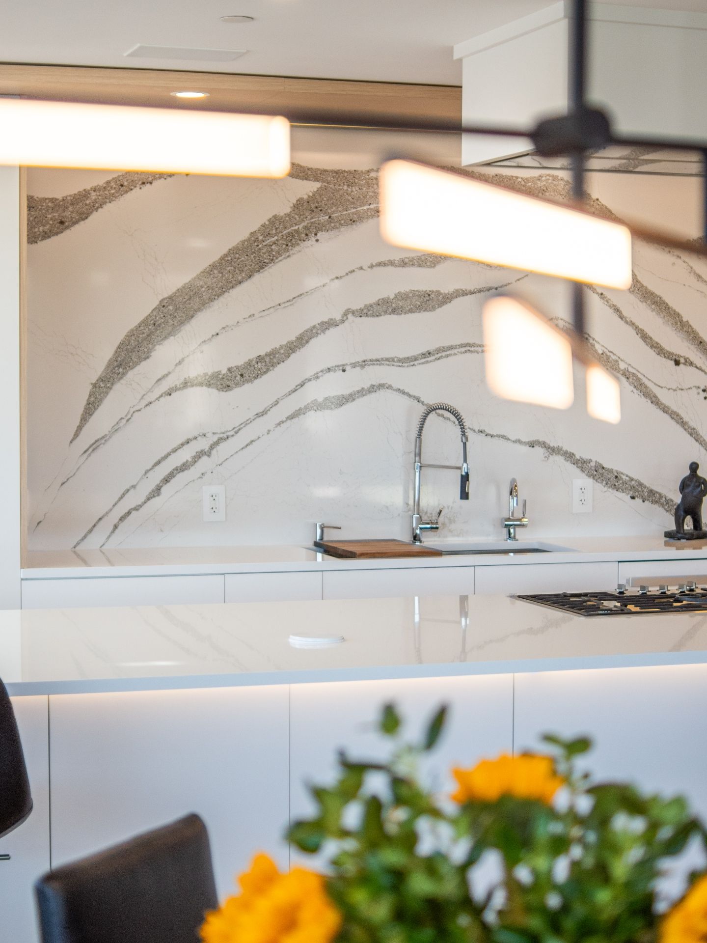 Step into the heart of this stunning penthouse condo and you'll find the kitchen of your dreams. Our team has created something truly special, featuring a 24-foot-long island that seamlessly blends with the extensive custom millwork and a stunning white, wood, and stone backsplash that will leave you in awe.