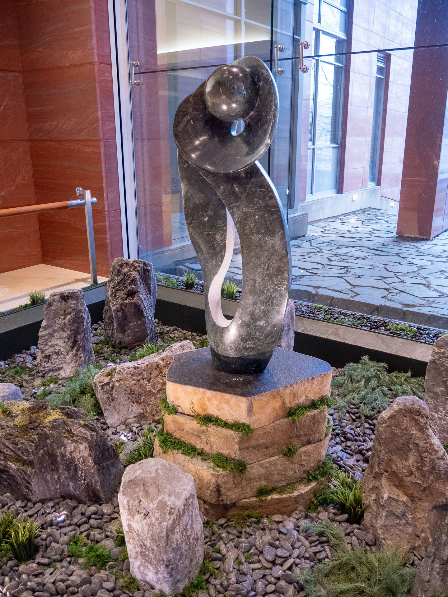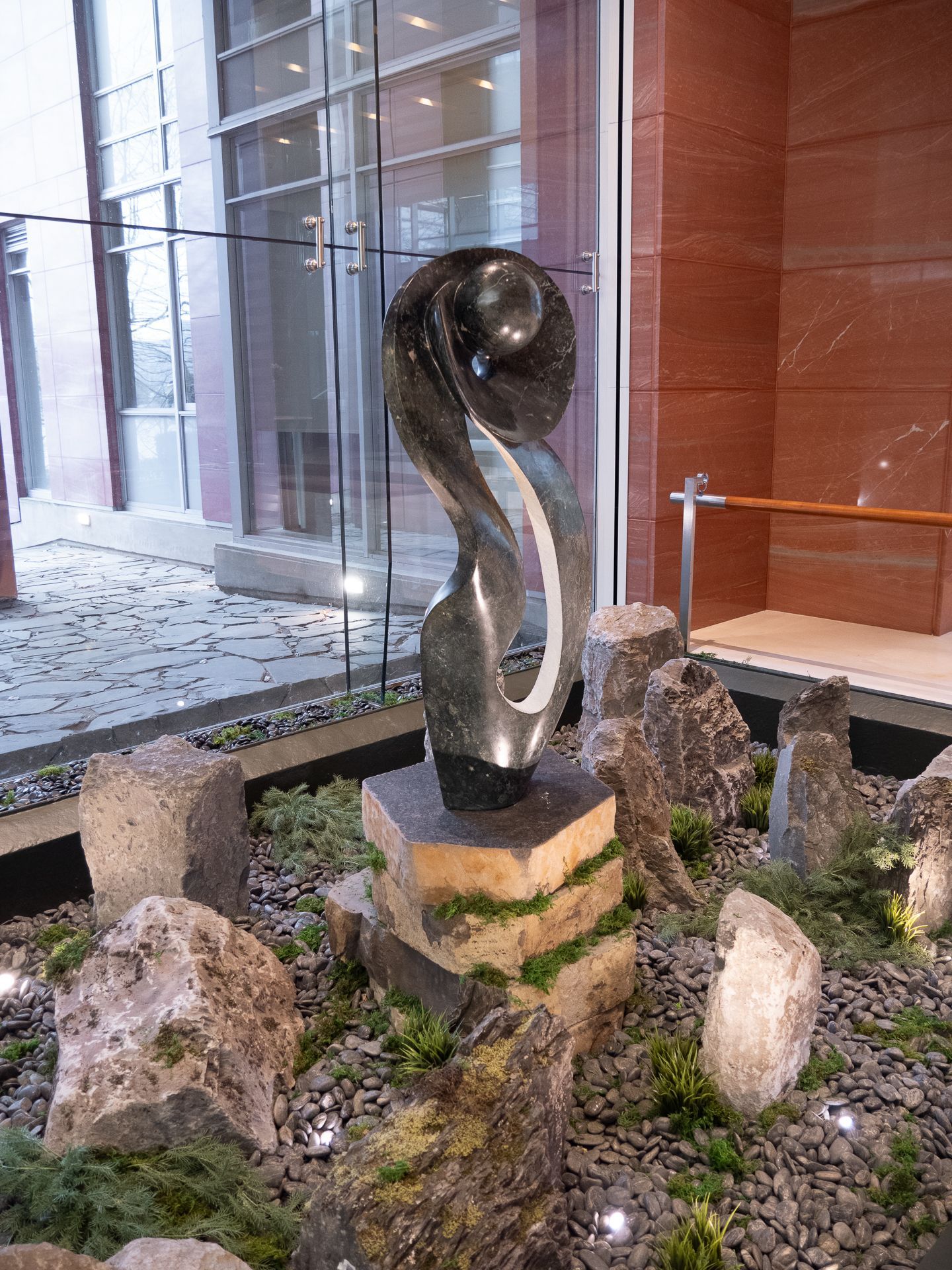 In its place is a stunning sculpture with a design aesthetic that creates a cohesive entranceway art piece. We designed this incredible Jade sculpture to sit on platforms of local Squamish rock with an array of coated stones. The result is something a little different for us, but it is still a project we have thoroughly enjoyed creating.