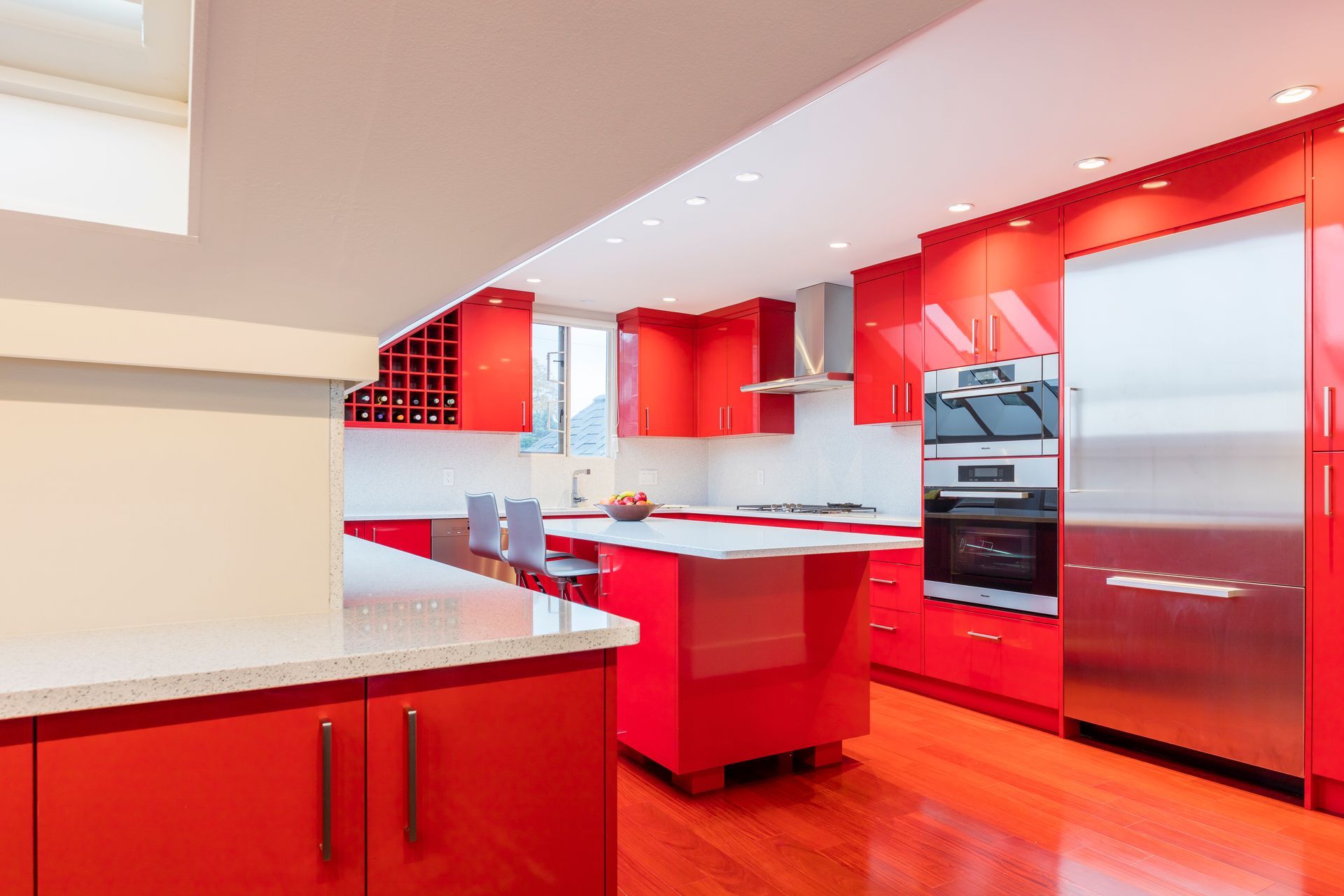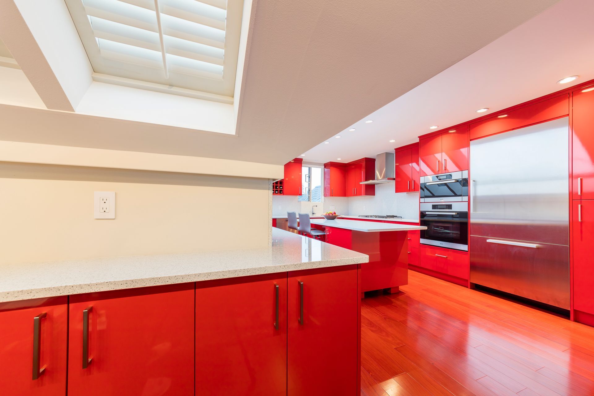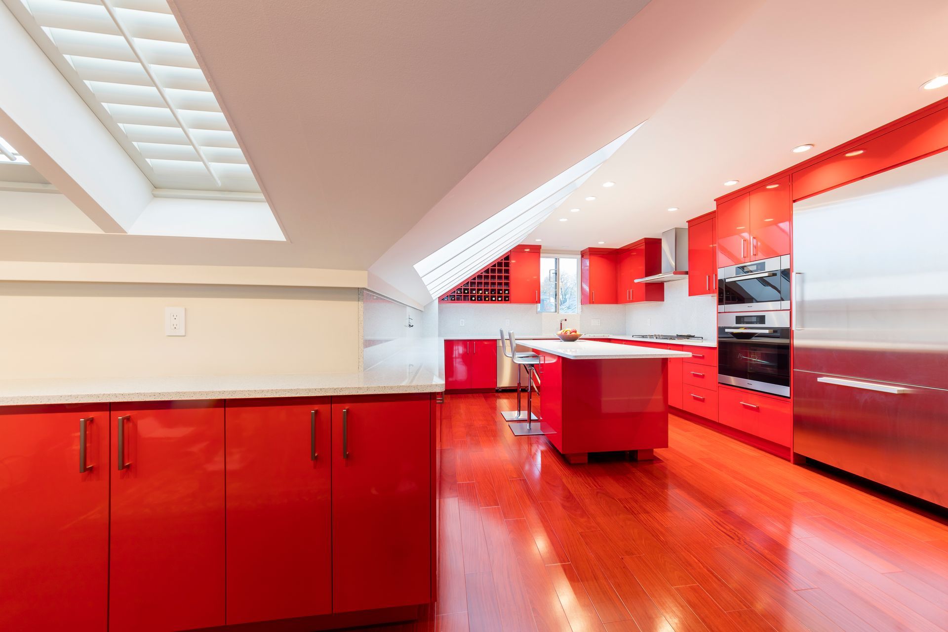 Be bold, be daring, be Rodrozen! Our homeowners went with our idea of daring to be a bit different with this spectacular kitchen renovation we designed and built in Kitsilano. The vivid red of this kitchen makes this a show-stopper for anyone walking in. But not to be overdone, we contrasted with keeping the colours balanced with a beautiful Cambria quartz countertop that keeps the red contained perfectly for this interior design theme.