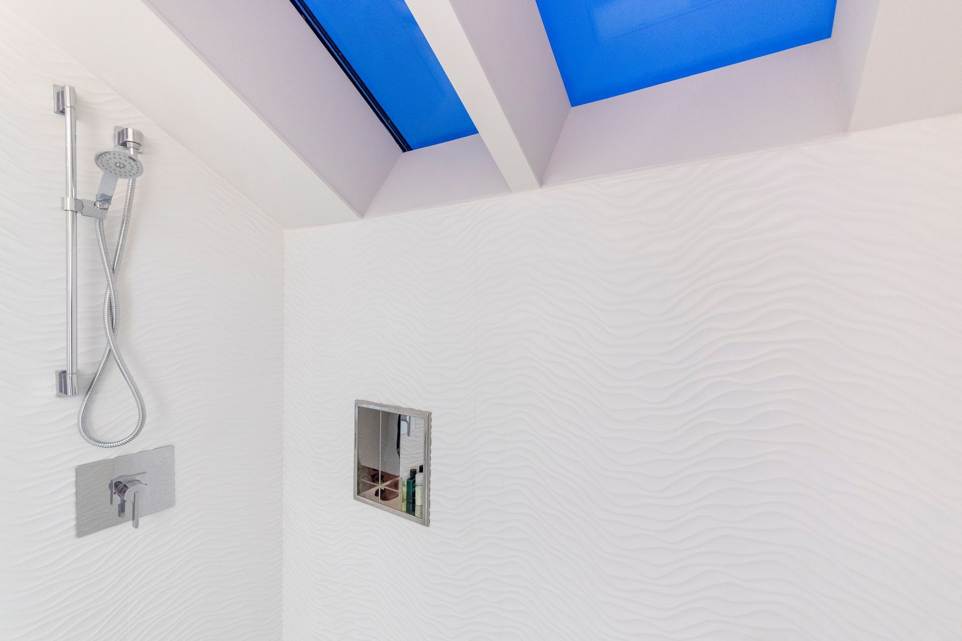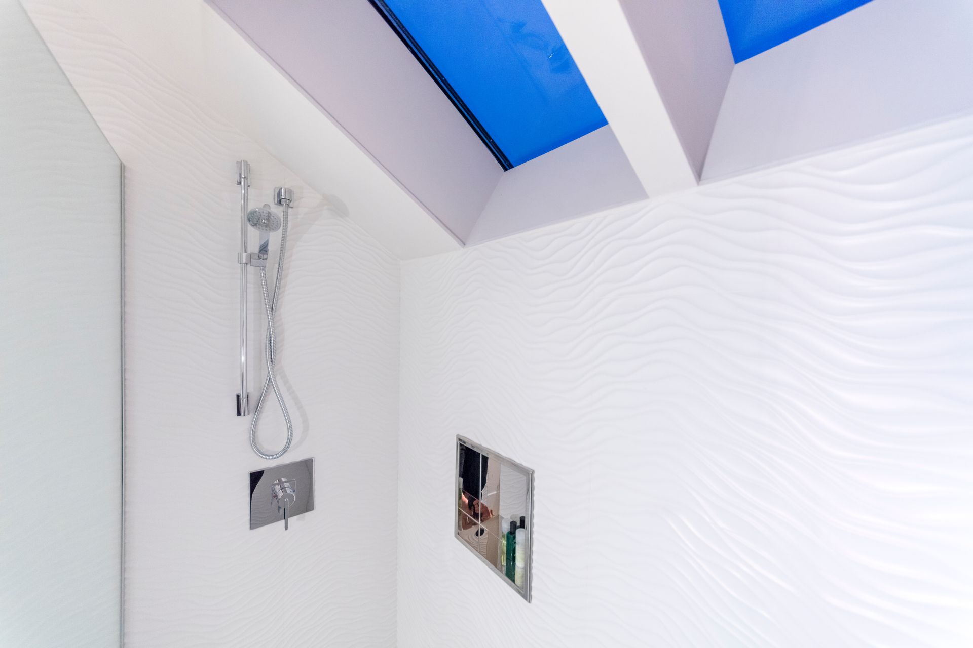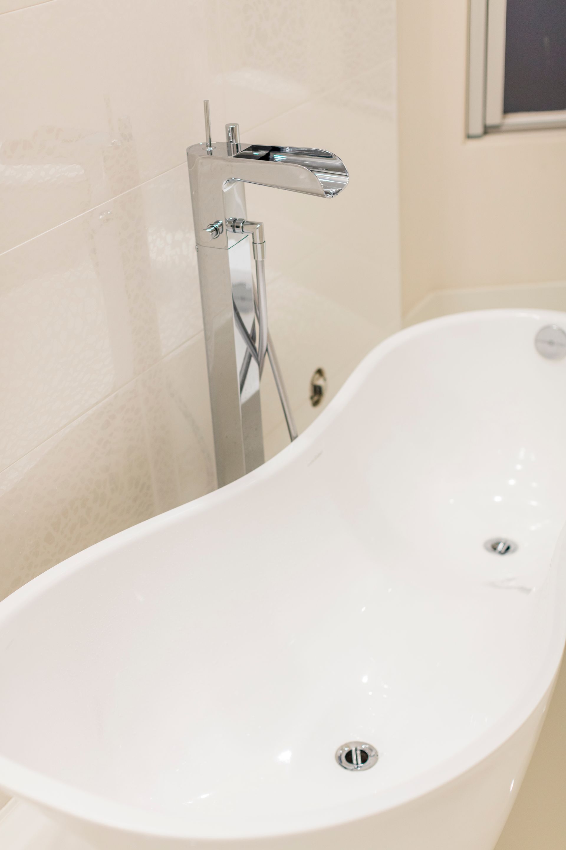 One of the bathrooms flaunts a classic white look with a touch of traditional, almost classical interior design. This bathroom features a curvy bathtub shape that adds elegance to its overall appearance. The shower area is adorned with white wavy tiles, giving it a distinct and stylish look. On the other hand, the second bathroom showcases a more traditional approach with a subtle modern touch. Both bathrooms are standout designs, each with its unique style and appeal.