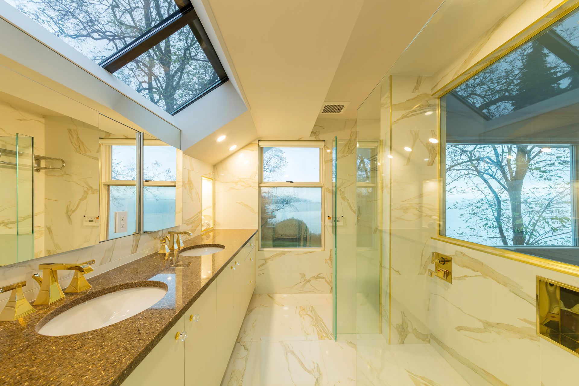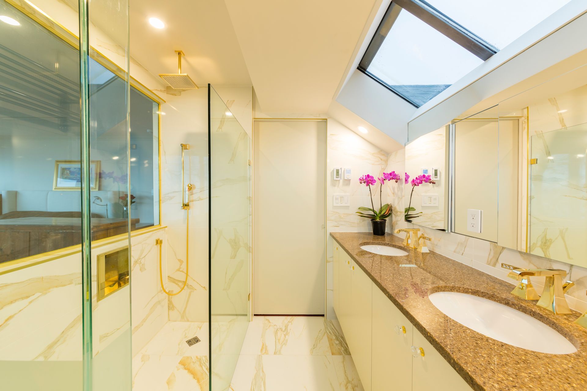 The townhouse in Kitsilano boasts a remarkable kitchen design that instantly grabs attention with its bold approach. However, the unique and distinct bathrooms of the house are equally impressive and deserve recognition.