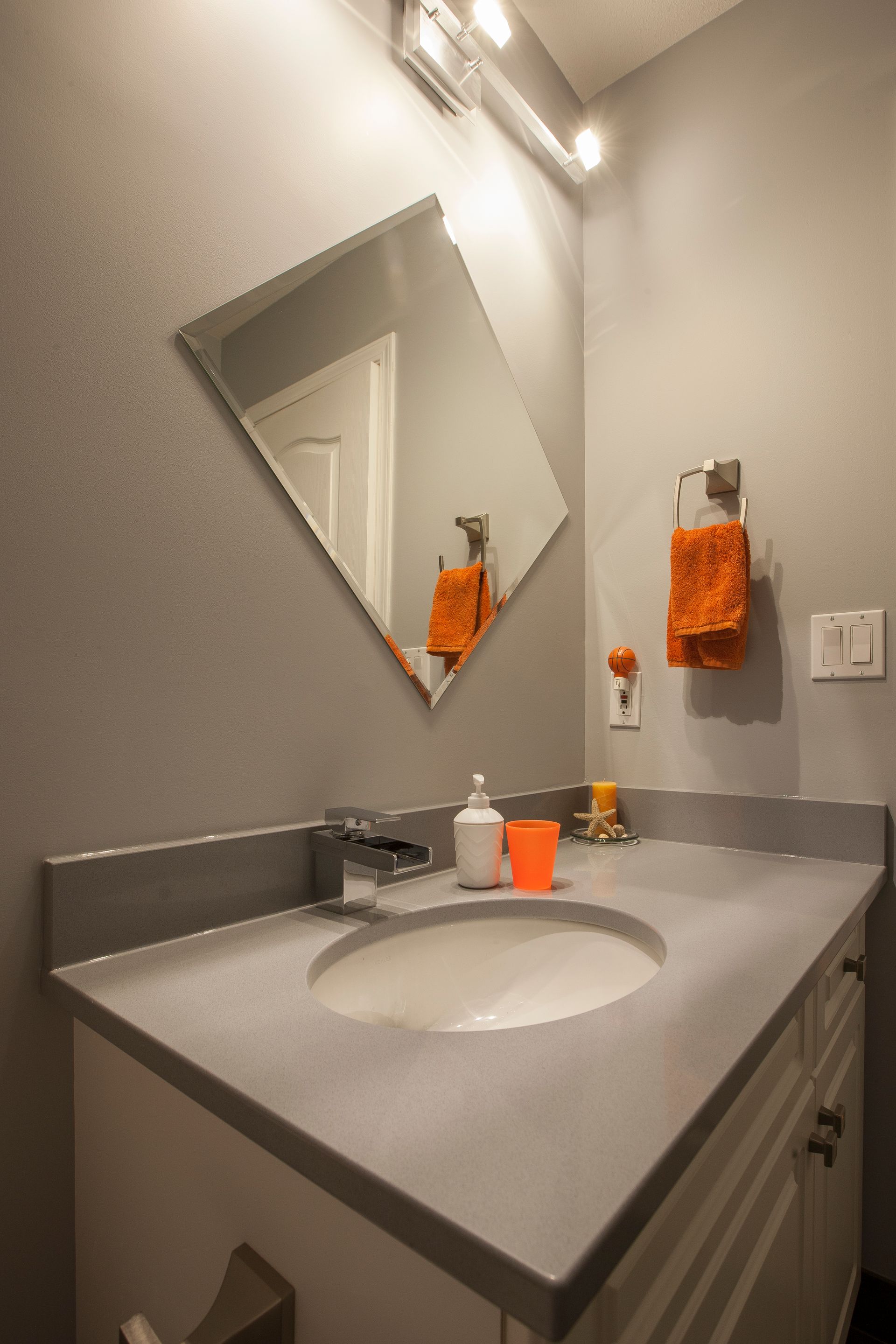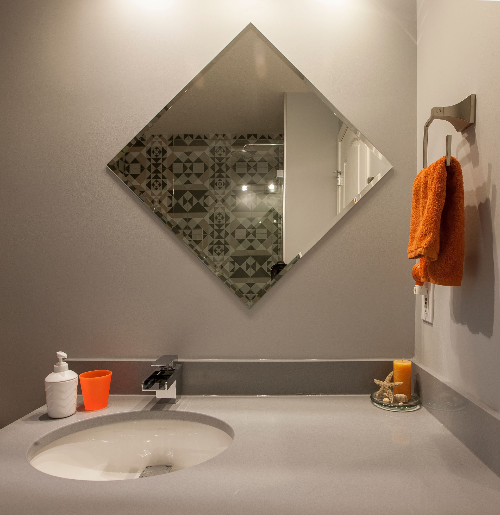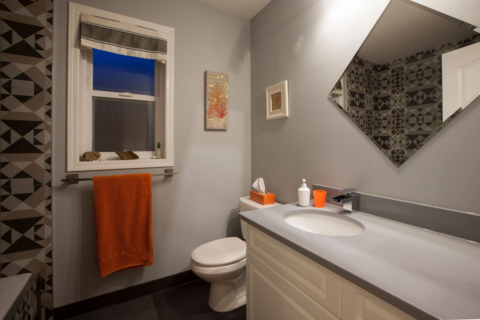 It's a game of two halves with this townhouse renovation in Lynn Valley in North Vancouver. A half - a kitchen renovation. The other - a bathroom. The striking feature of the bathroom is the triangular mirror, which makes a statement. On the other hand, the kitchen completes the central part of this home with a classic style that doesn't take it so far as to feel old.